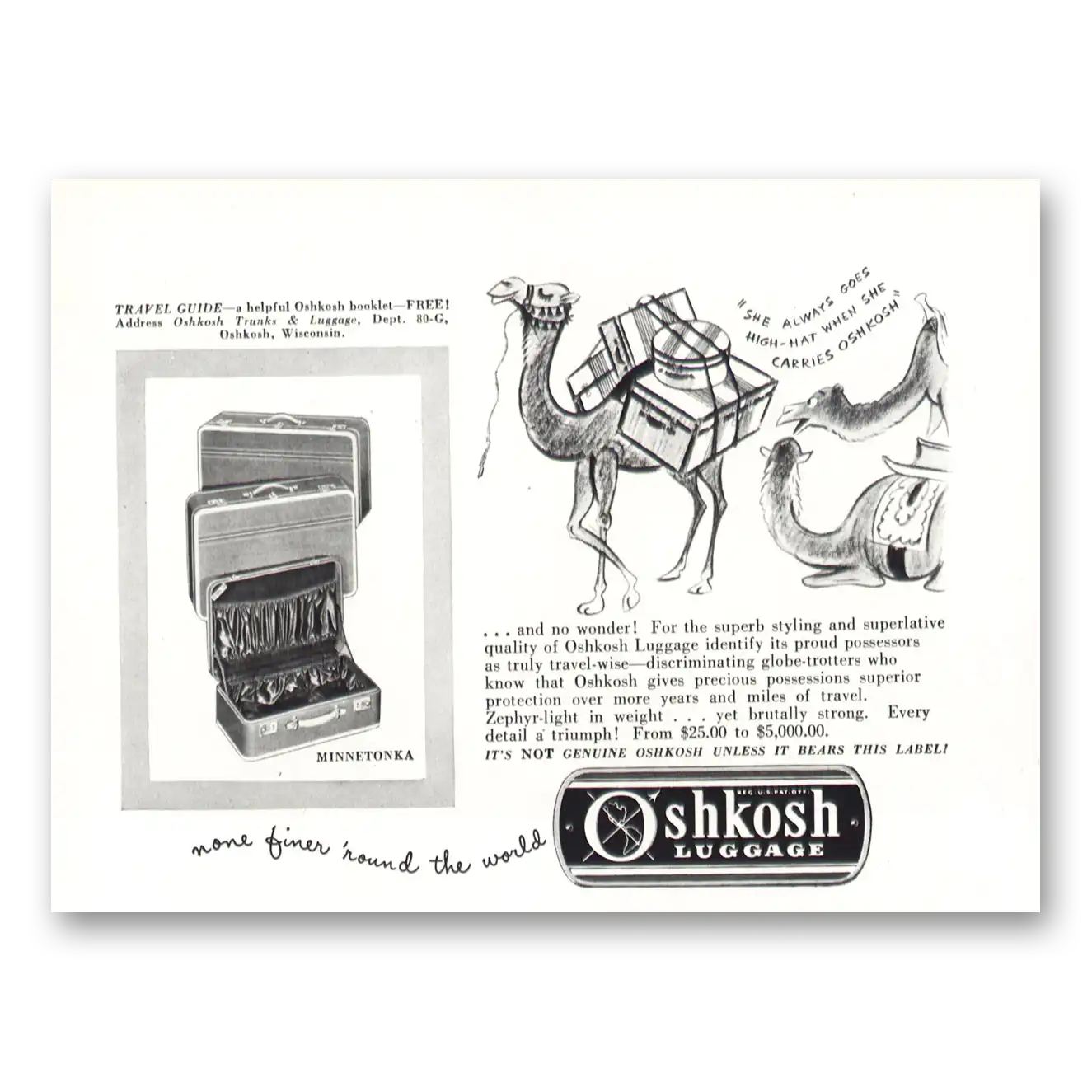 This is an original 1948 Oshkosh Trunks and Luggage print ad published by Oshkosh Trunks and Luggage.
