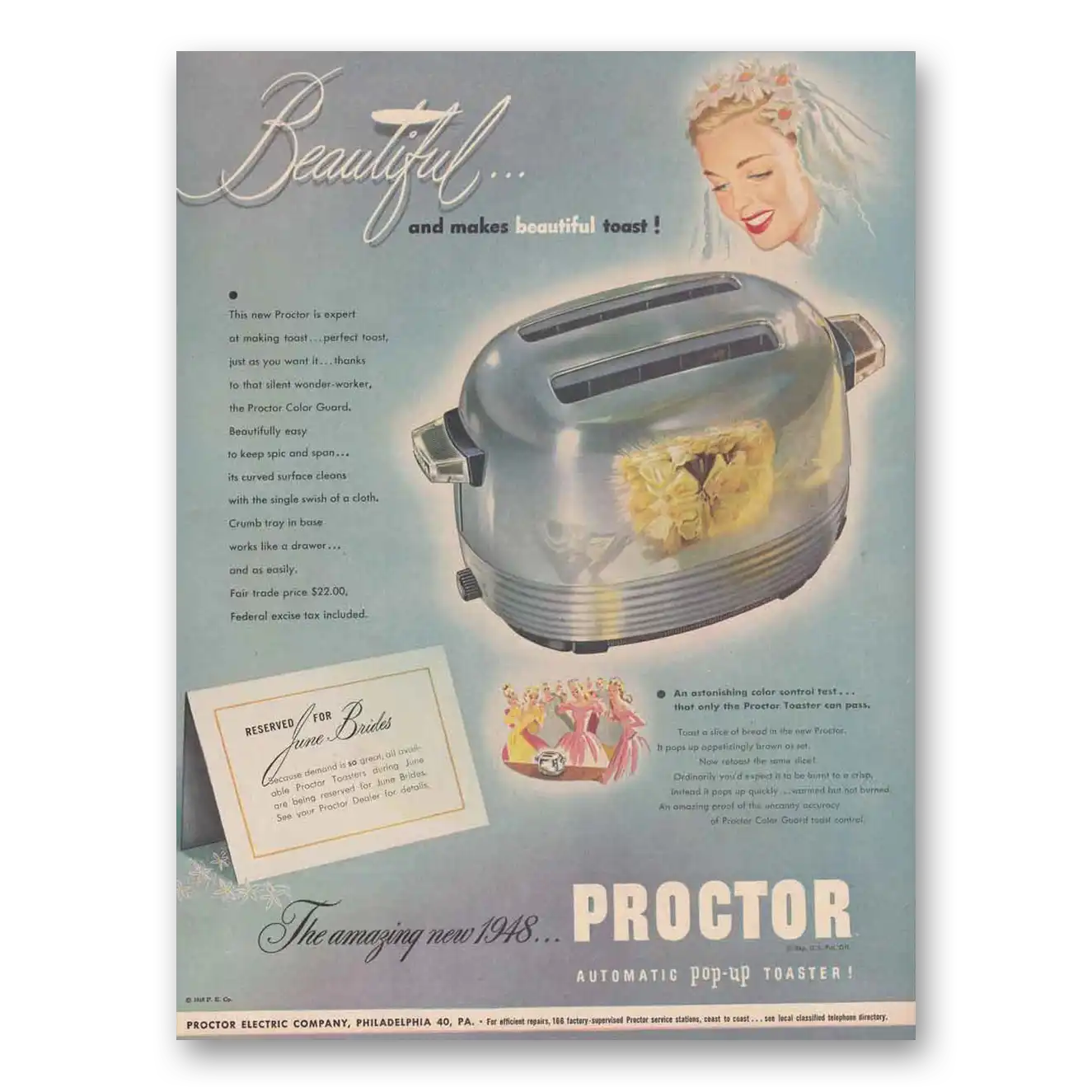 This is an original 1948 Proctor Toaster print ad published by Proctor Electric Company.