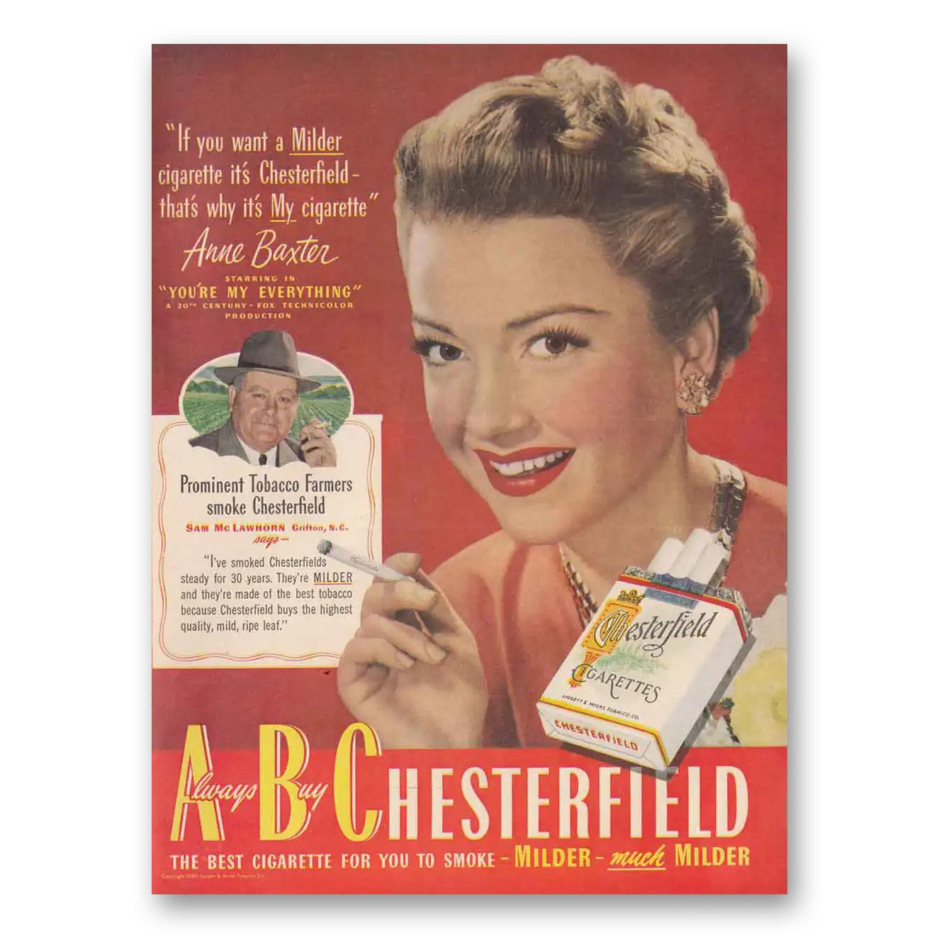 1949 Chesterfield Cigarettes Print Ad | Anne Baxter