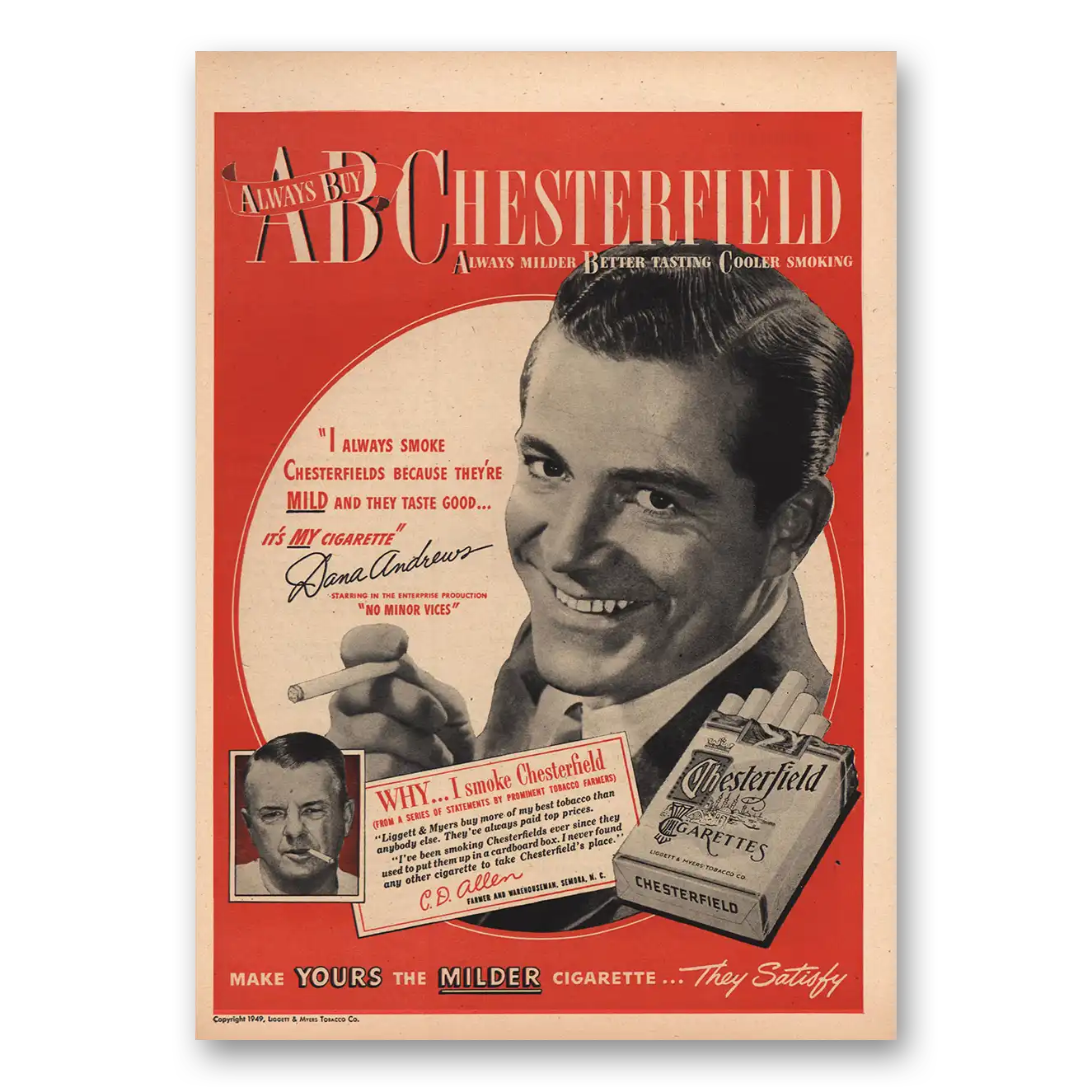 This is an original 1949 Chesterfield Cigarettes print ad published by Chesterfield Cigarettes.