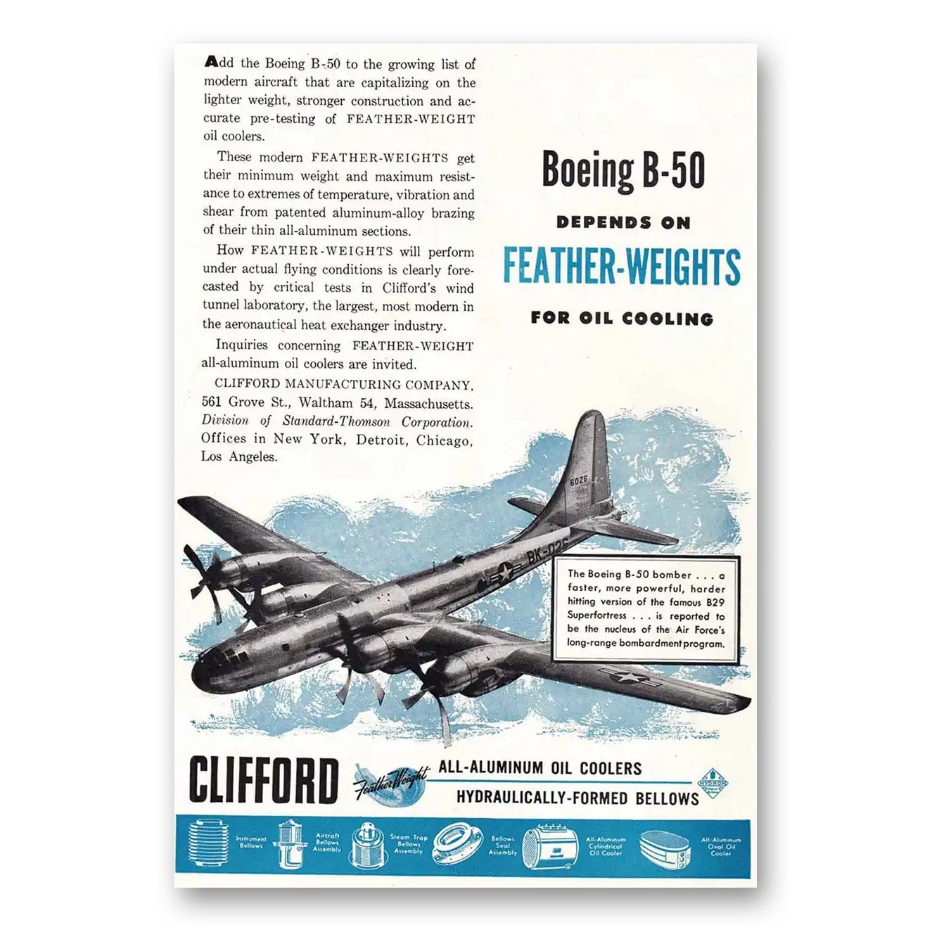 1949 Clifford All-Aluminum Oil Coolers Print Ad | Boeing B 50