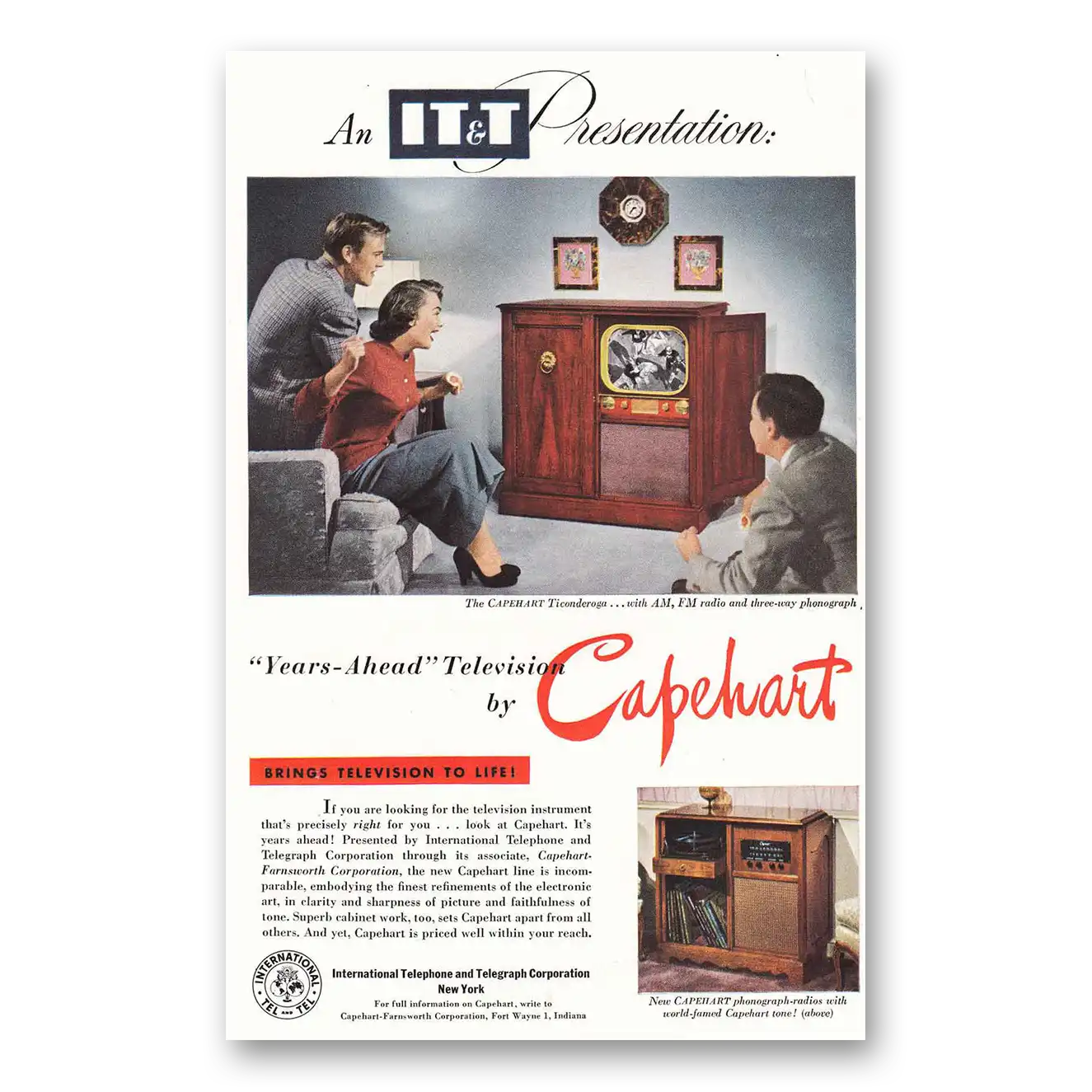 This is an original 1950 Capehart Television print ad published by ITT International Telephone.