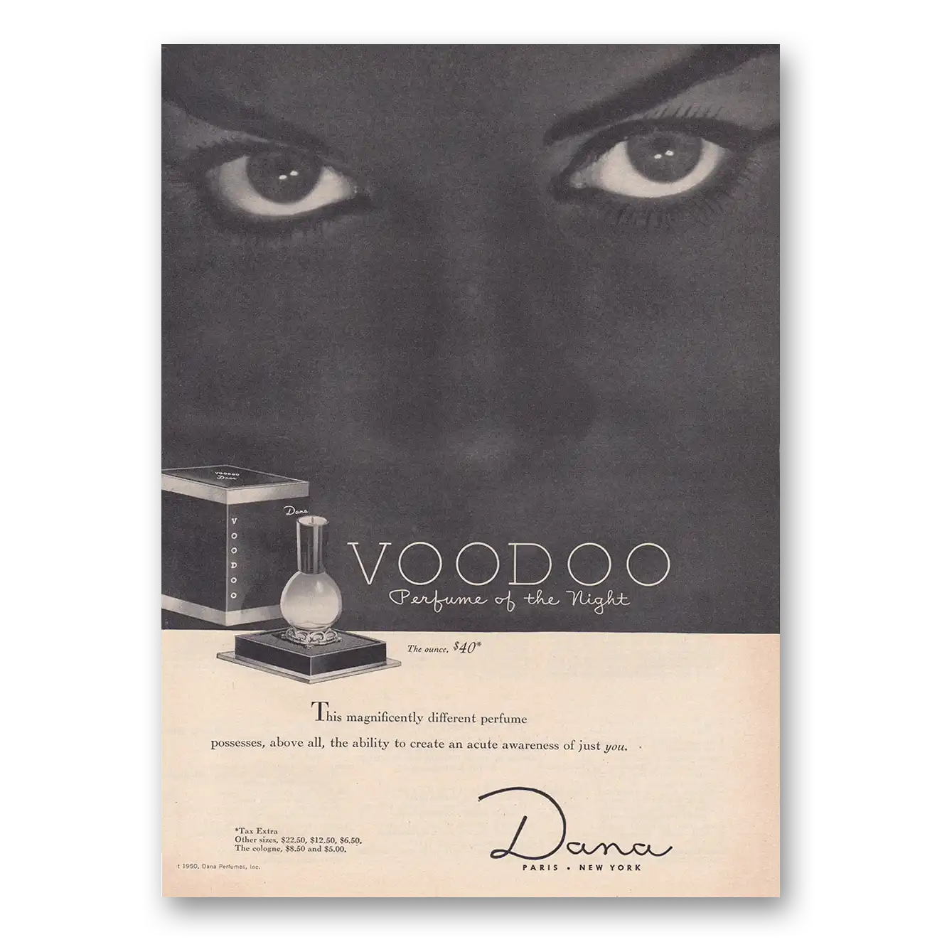 This is an original 1950 Dana Voodoo Perfume print ad published by Dana Perfumes.