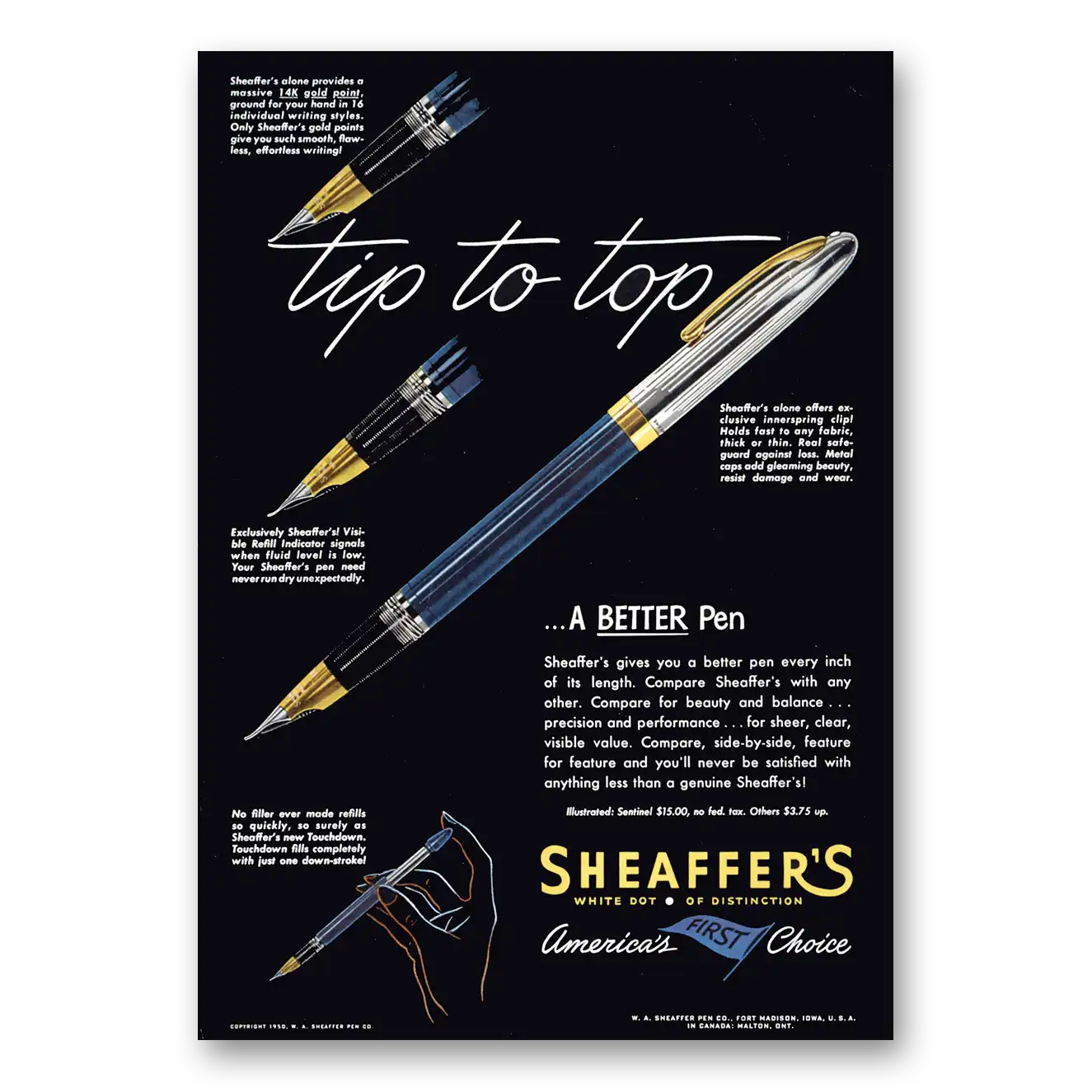 1950 Sheaffer Pen Print Ad | Tip Top