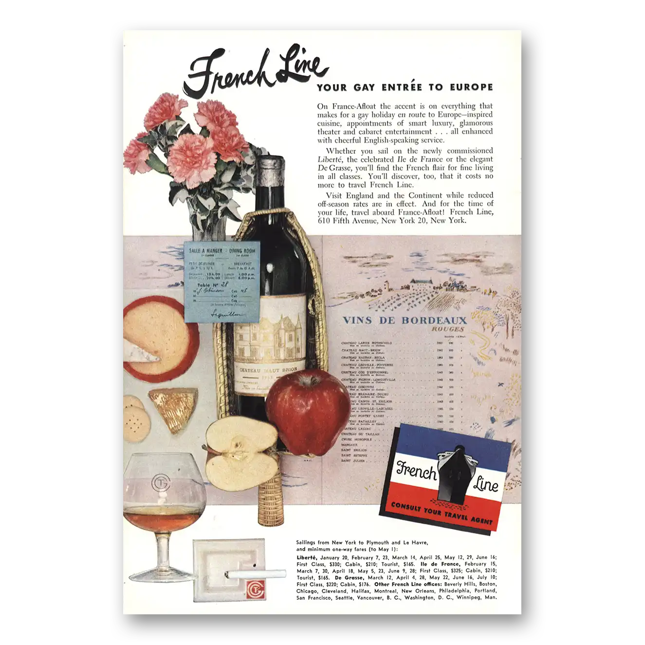1951 French Line Print Ad | Gay Entree To Europe