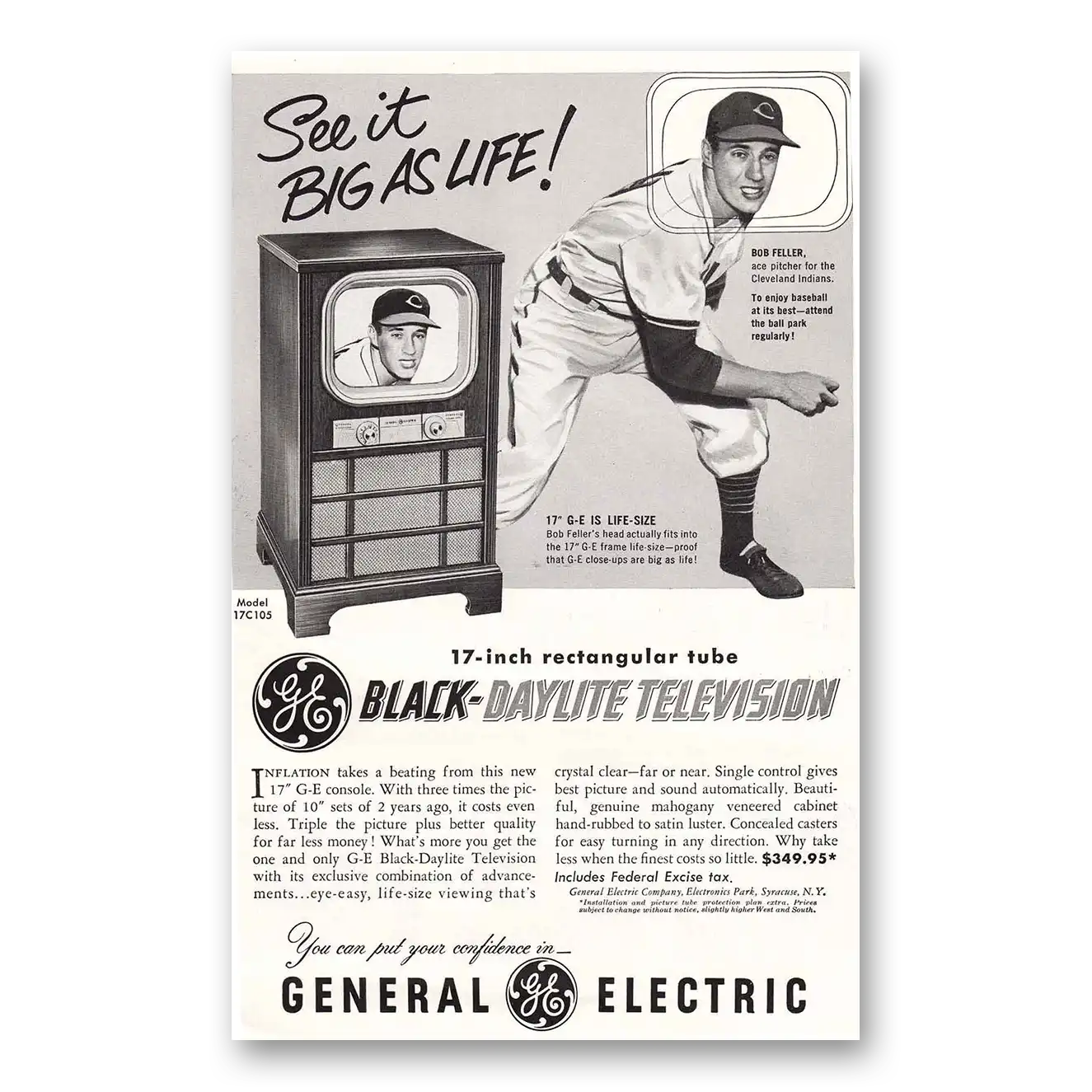 1951 General Electric Television Print Ad | Bob Feller