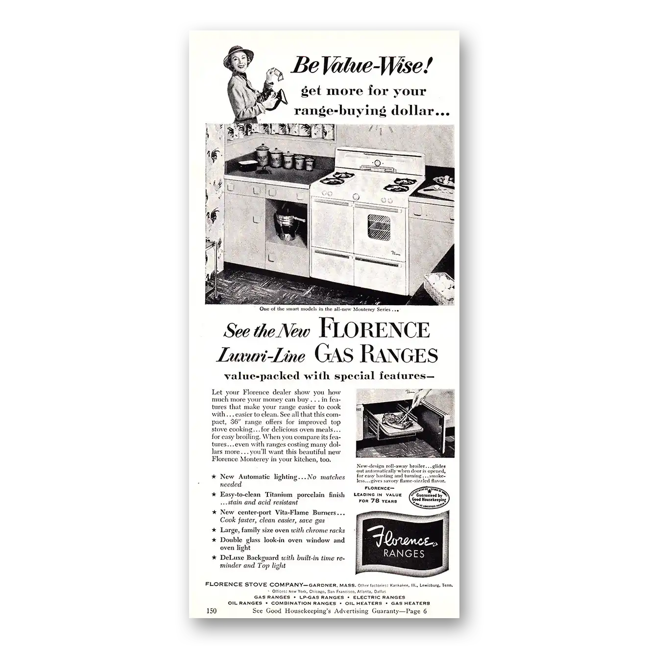 This is an original 1952 Florence Gas Range print ad published by Florence Stove Company.