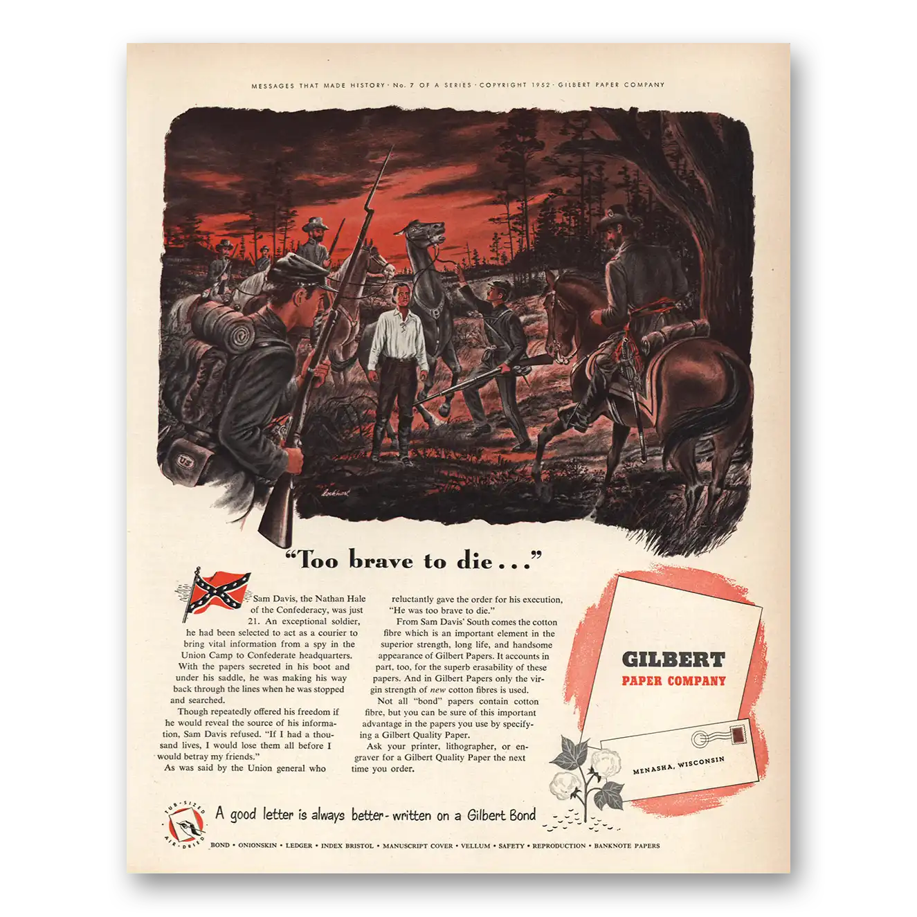 1952 Gilbert Paper Print Ad | Too Brave To Die