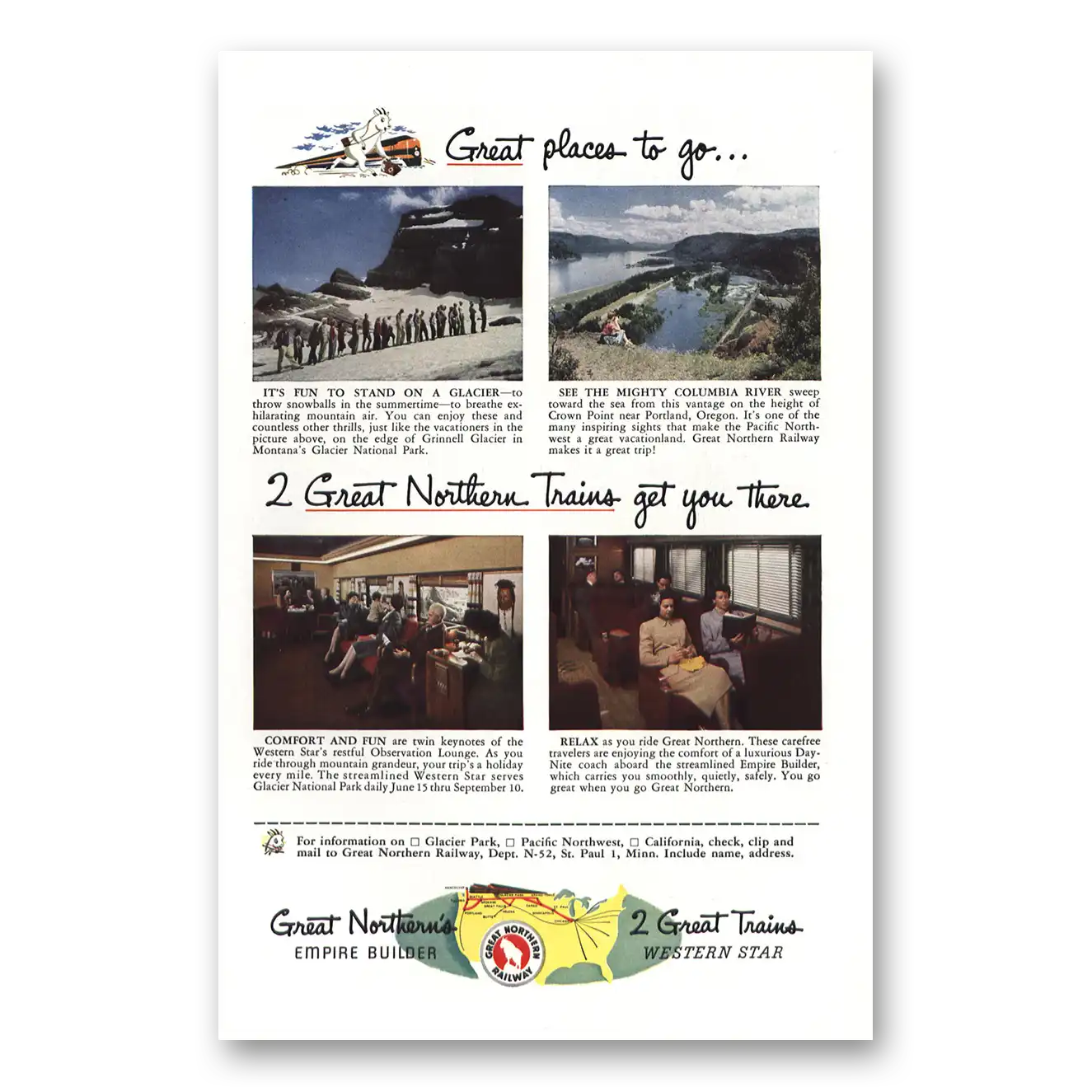 This is an original 1952 Great Northern Railway print ad published by Great Northern Railway.