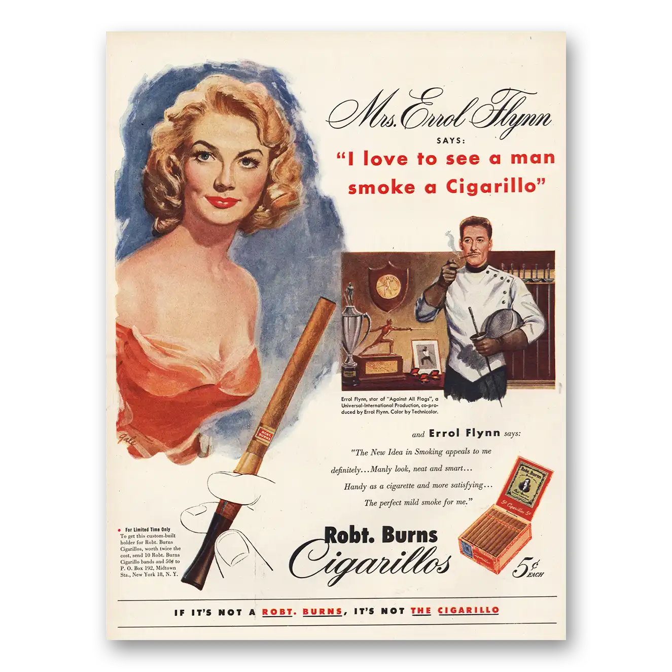 1952 Robt Burns Cigars Print Ad | Mrs Errol Flynn