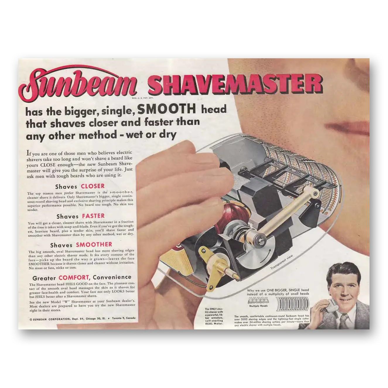 This is an original 1952 Sunbeam Shavemaster print ad published by Sunbeam.