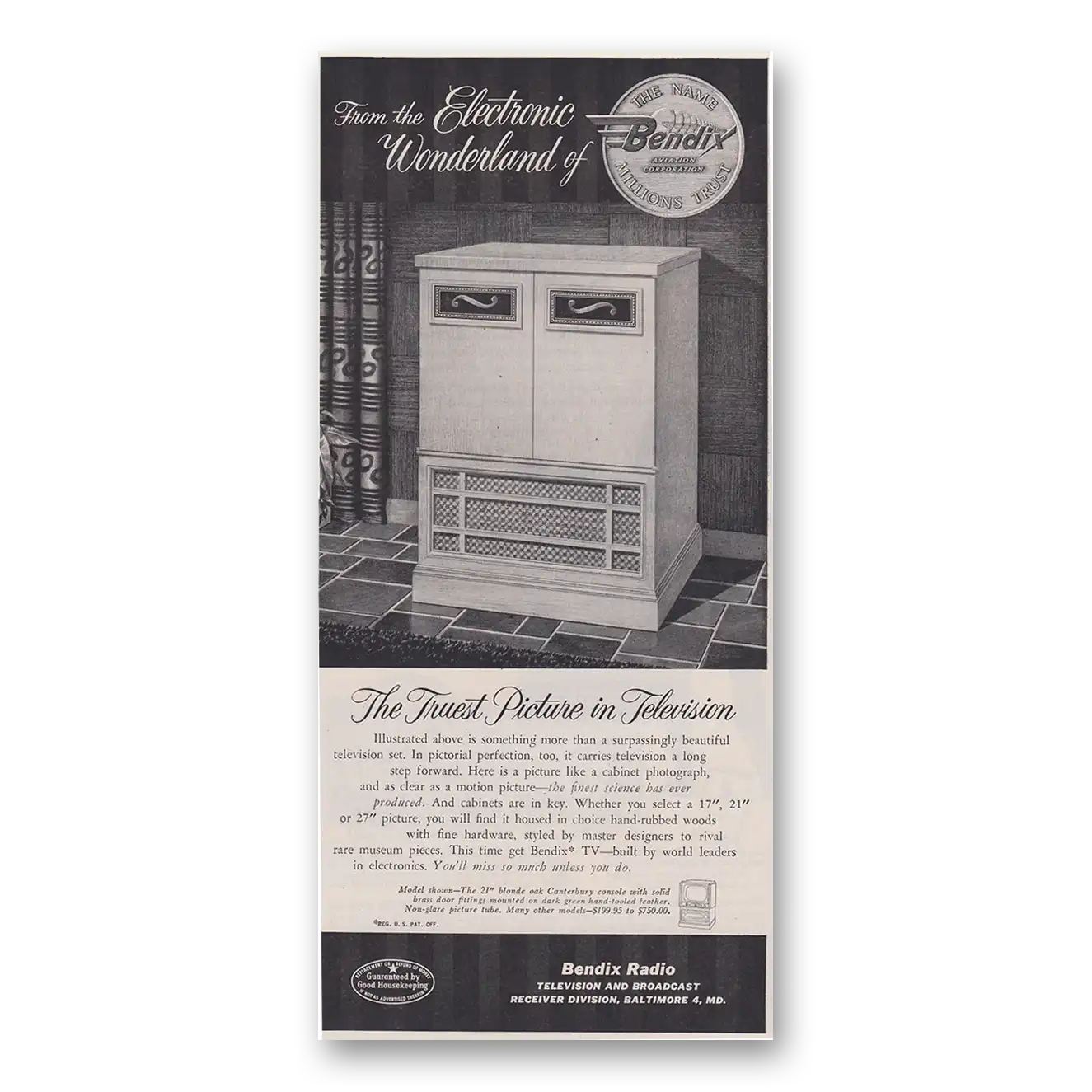 1953 Bendix Radio Print Ad | Truest Picture