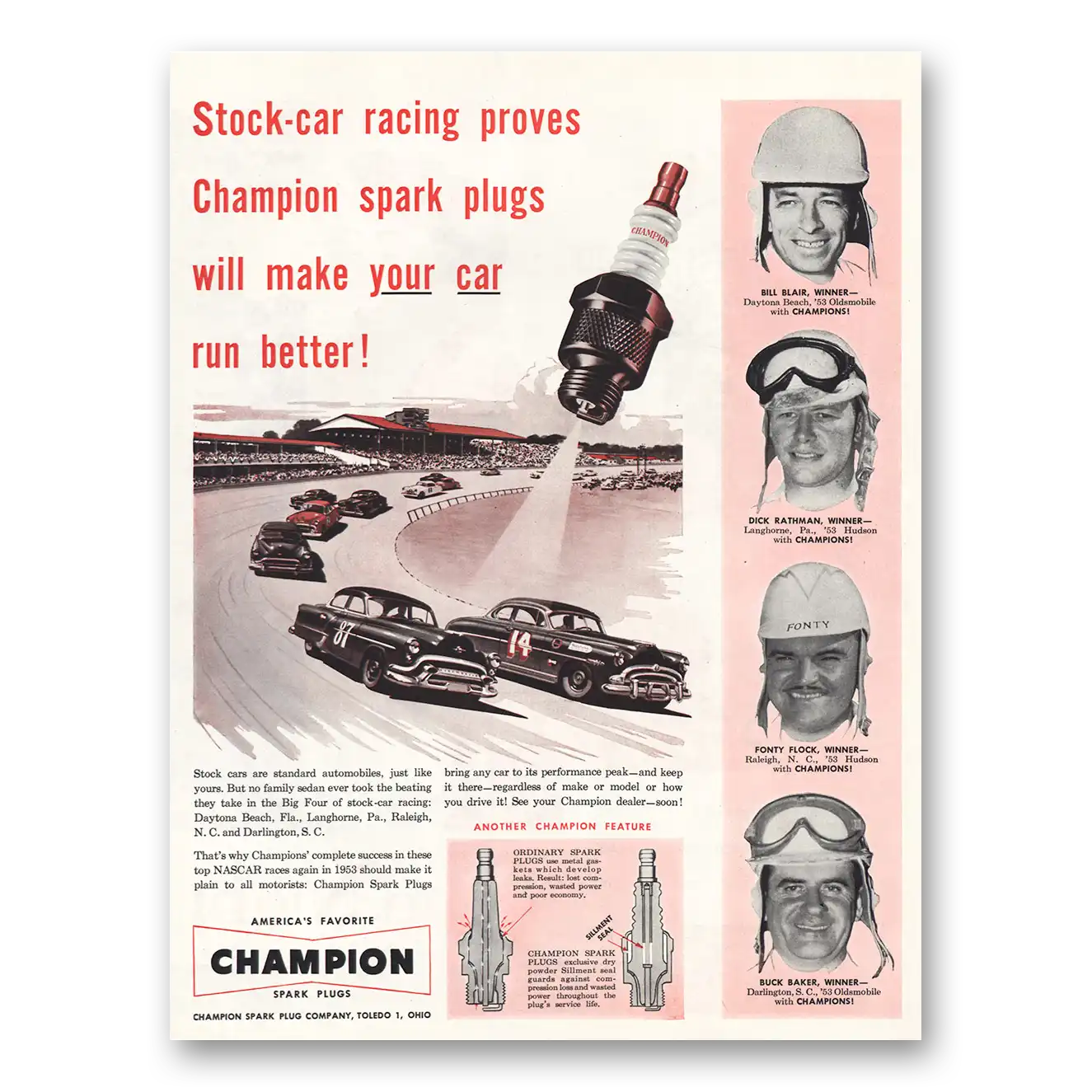 1953 Champion Spark Plugs Print Ad | Stock Car Racing