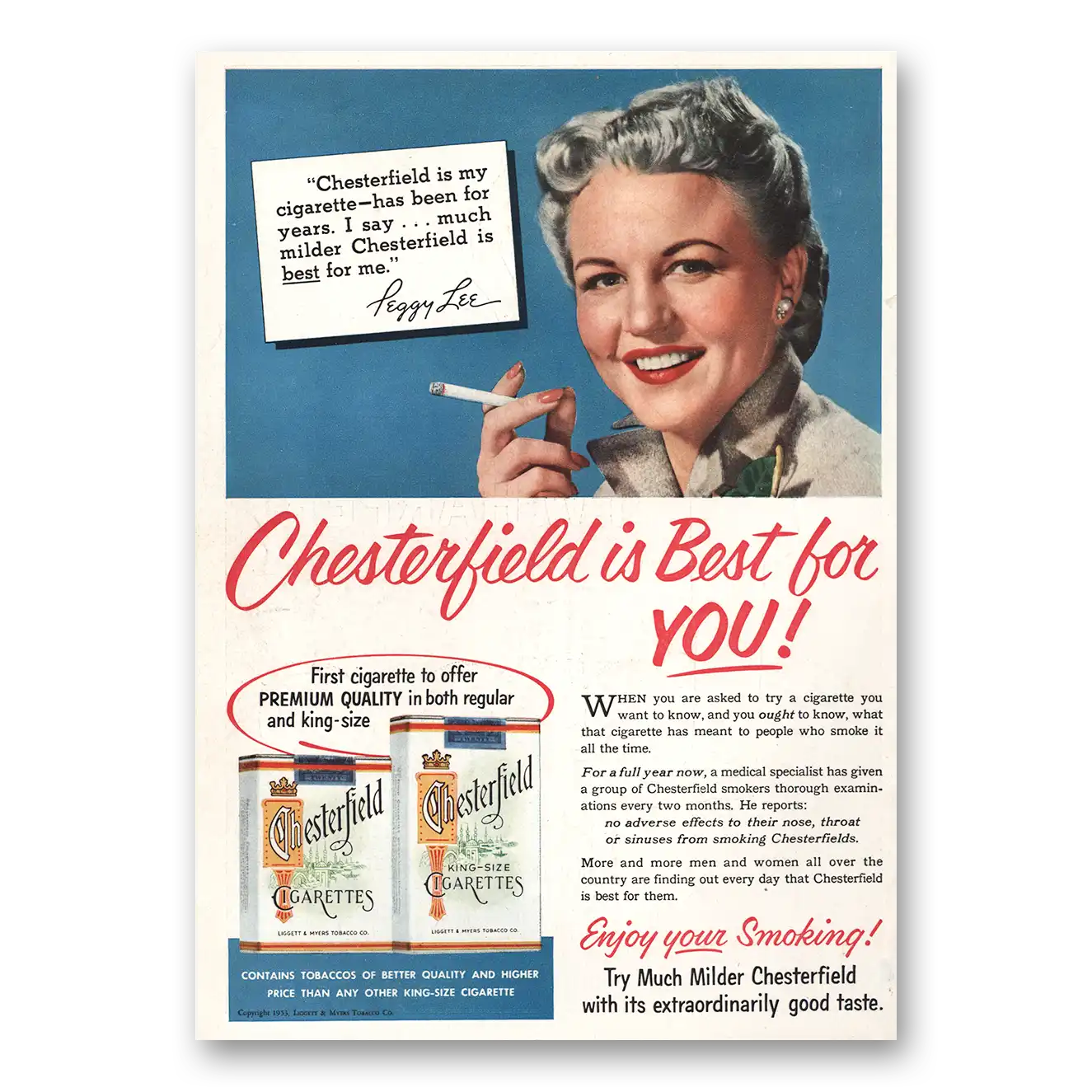 1953 Chesterfield Cigarettes Print Ad | Peggy Lee