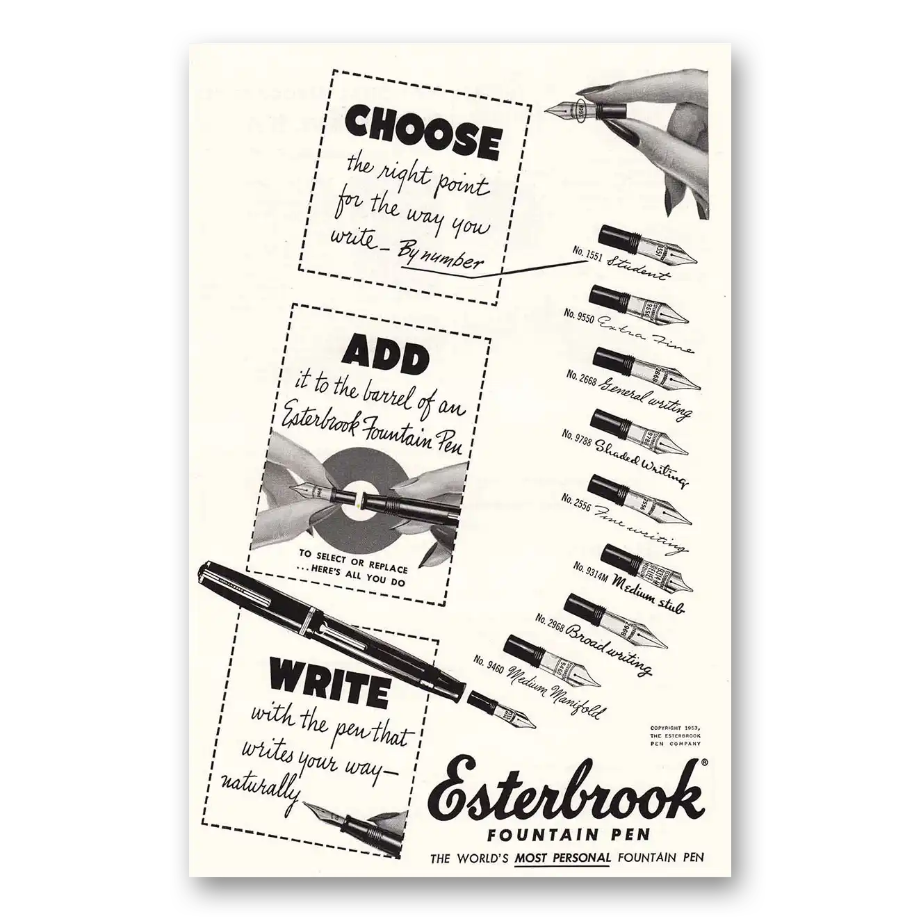 This is an original 1953 Esterbrook Fountain Pen print ad published by Esterbrook.