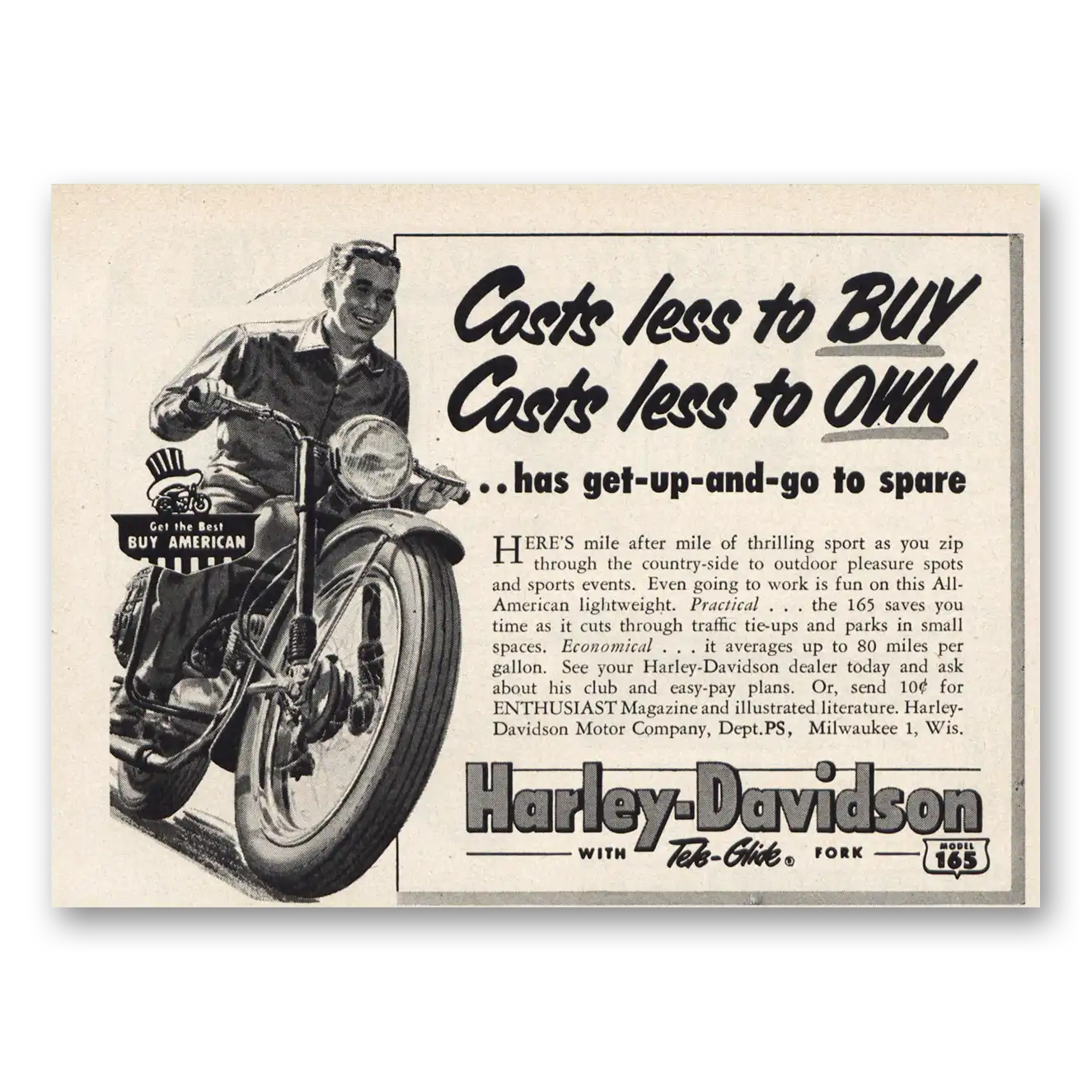 1953 Harley Davidson 165 Print Ad | Costs Less