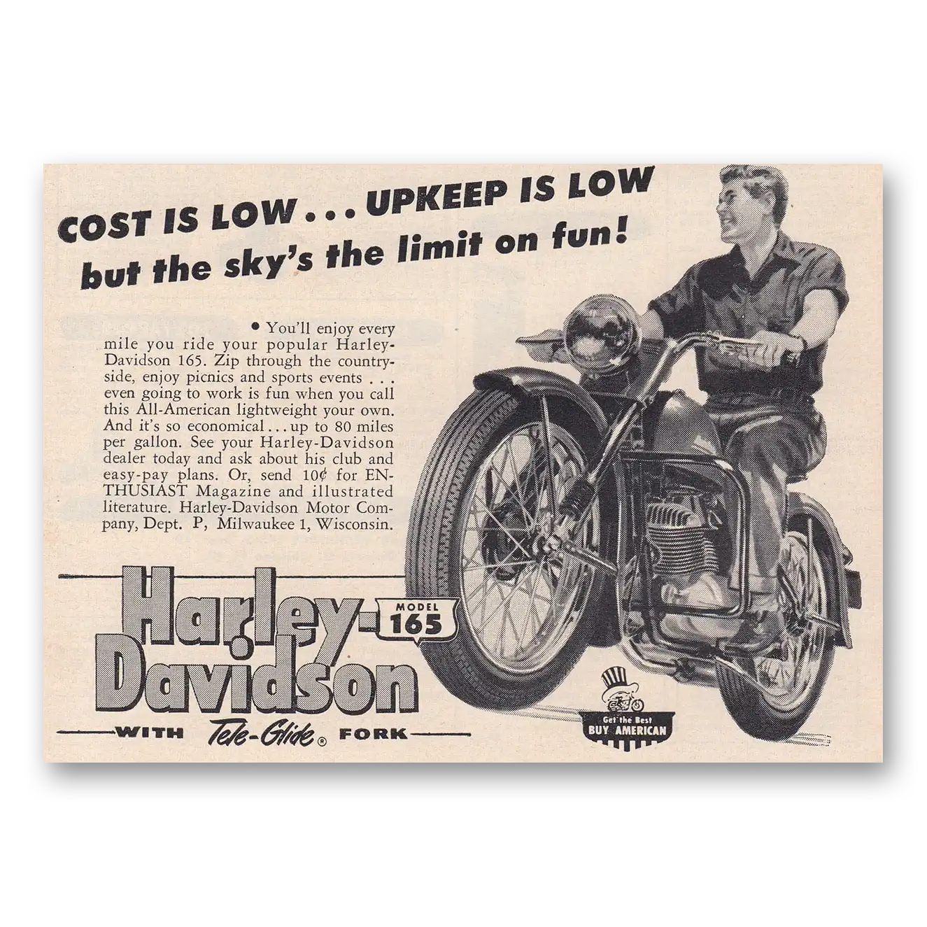 1953 Harley Davidson 165 Print Ad | Upkeep Is Low