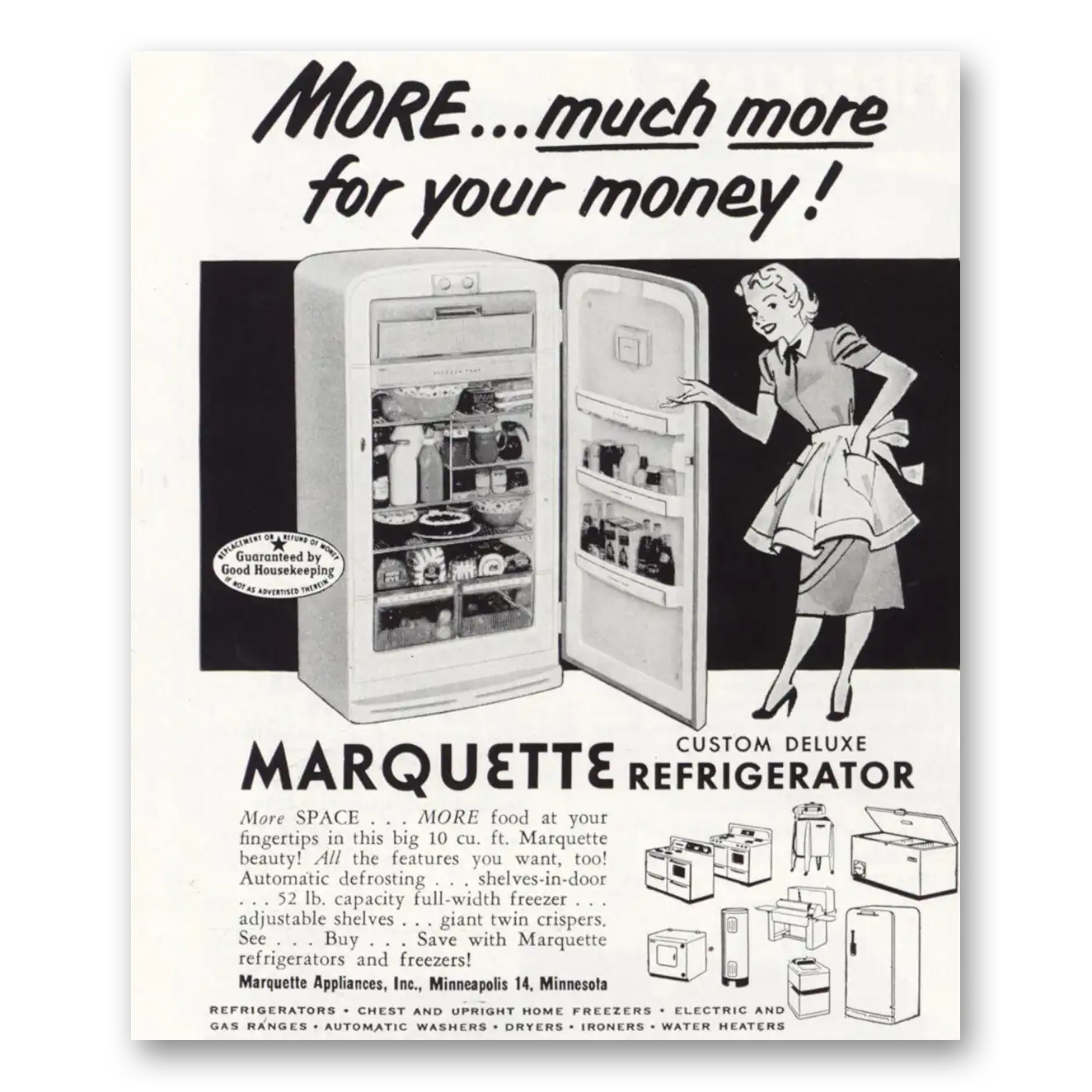 This is an original 1953 Marquette Refrigerator print ad published by Marquette Refrigerator.