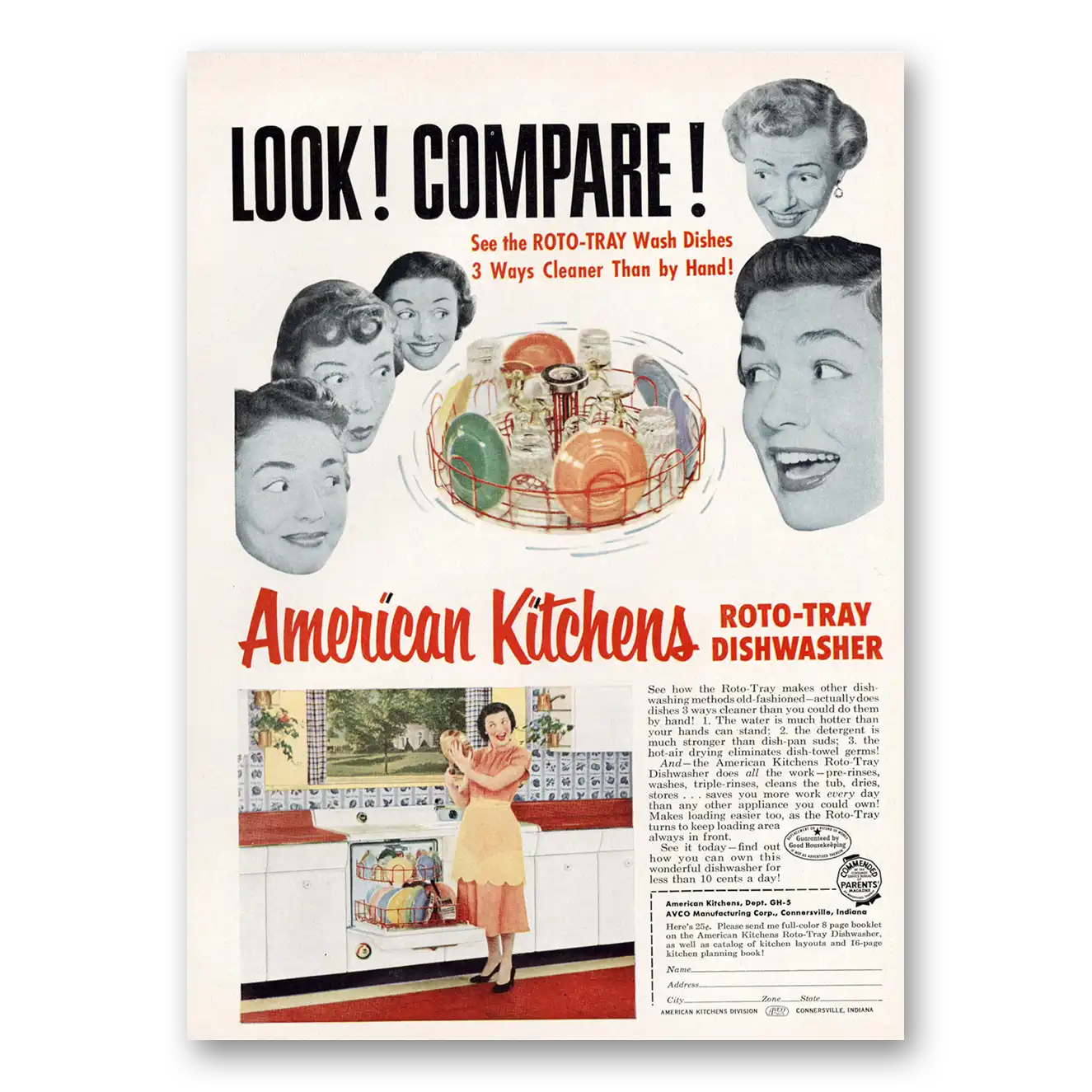 This is an original 1953 Roto Tray Dishwasher print ad published by American Kitchens.