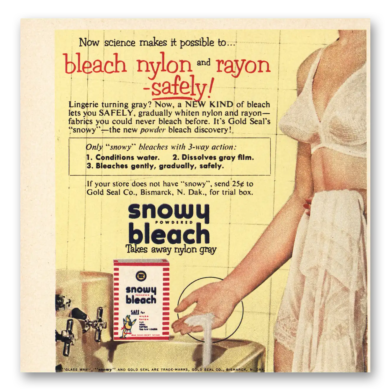 This is an original 1953 Snowy Bleach print ad published by Gold Seal Co.