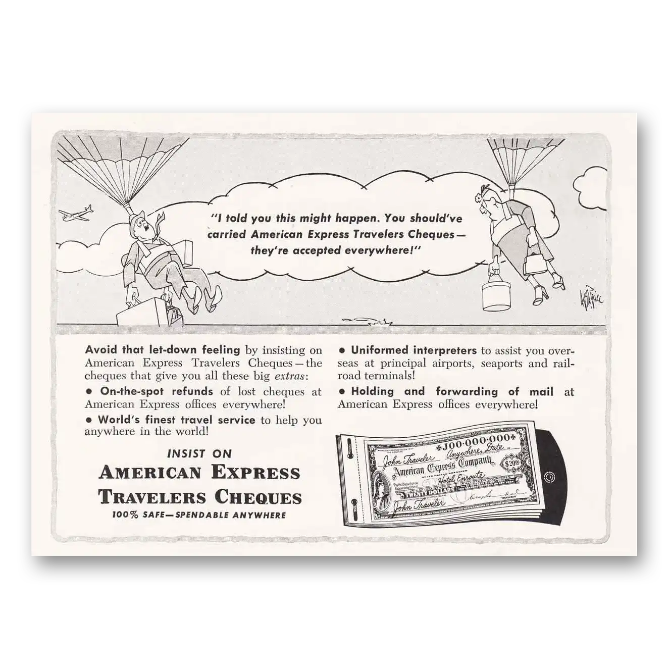 1954 American Express Travelers Cheques Print Ad | Parachutes