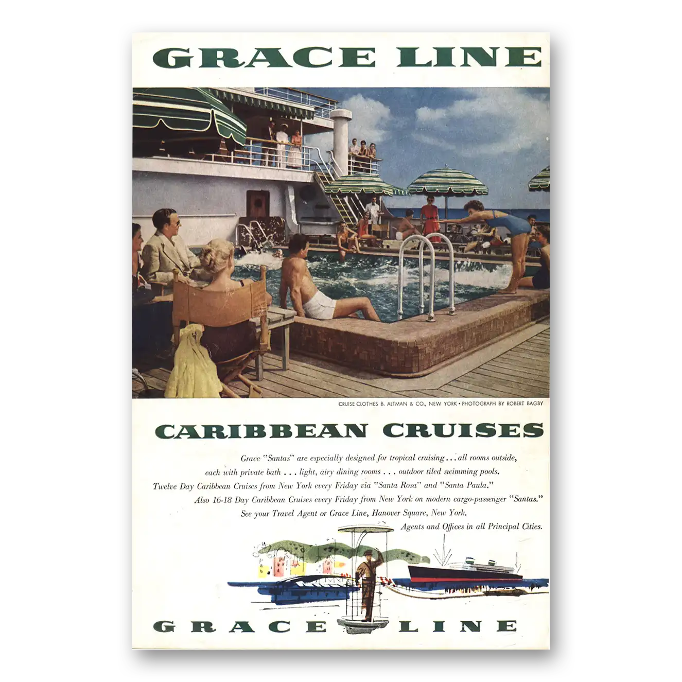 1954 Grace Line Print Ad | Caribbean Cruises Pool Deck