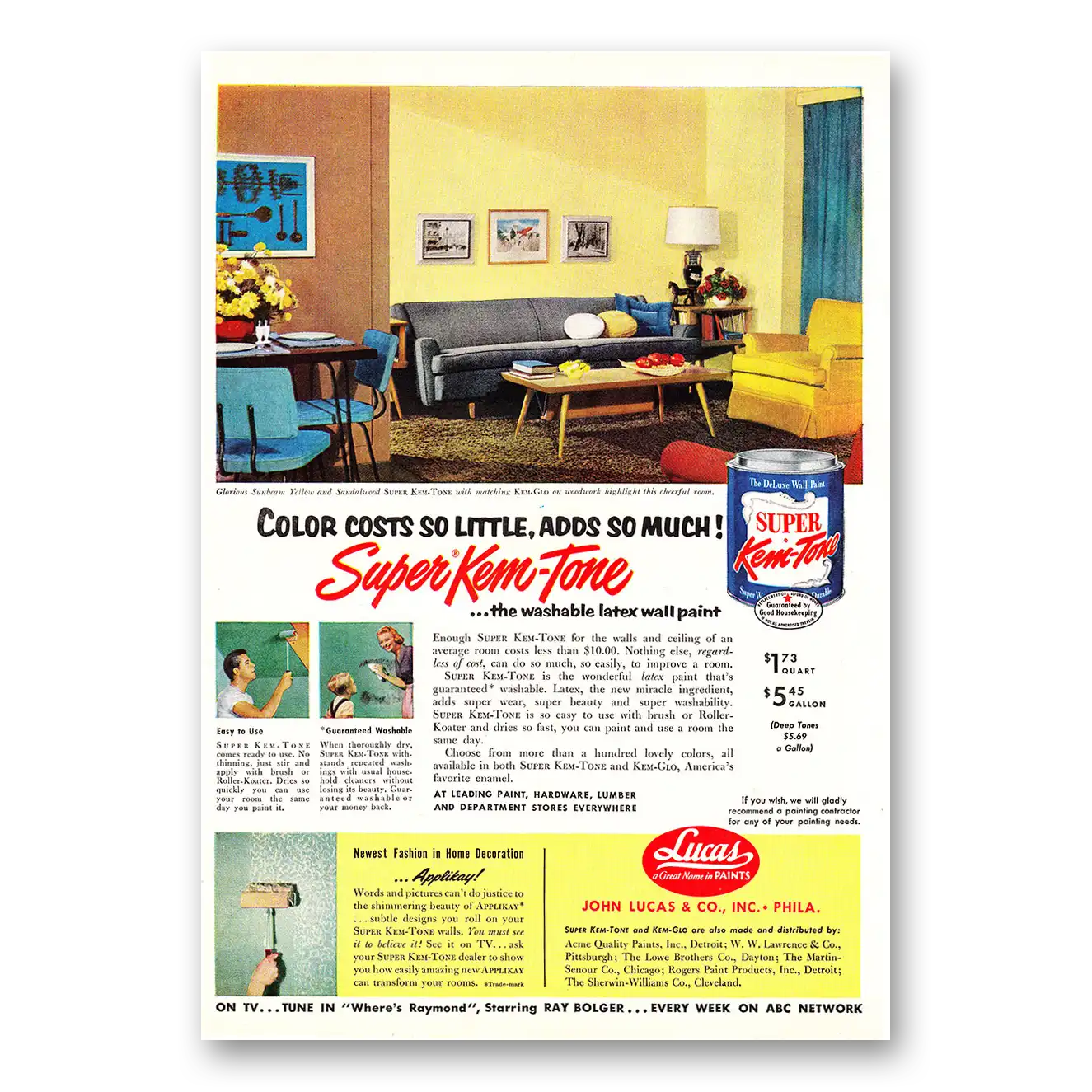 This is an original 1954 Super Kem Tone Paint print ad published by Kem-Tone.
