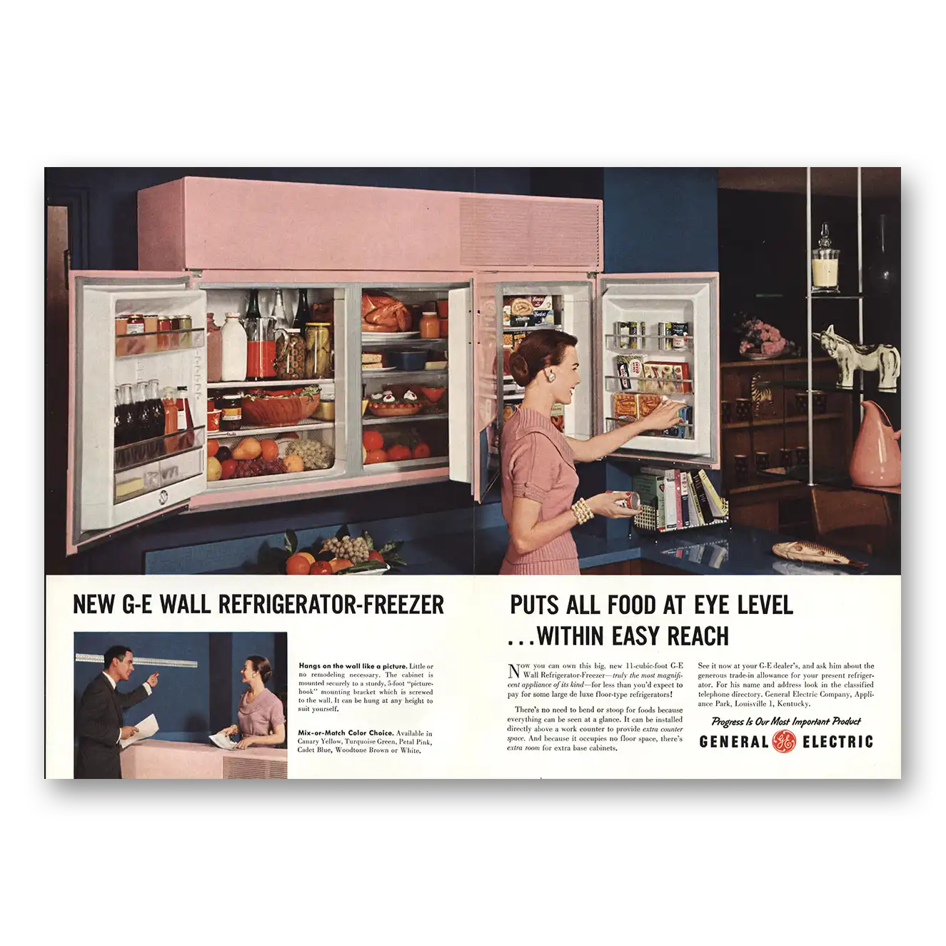 1955 General Electric Refrigerator Print Ad | Wall Refrigerator Freezer Food At Eye Level