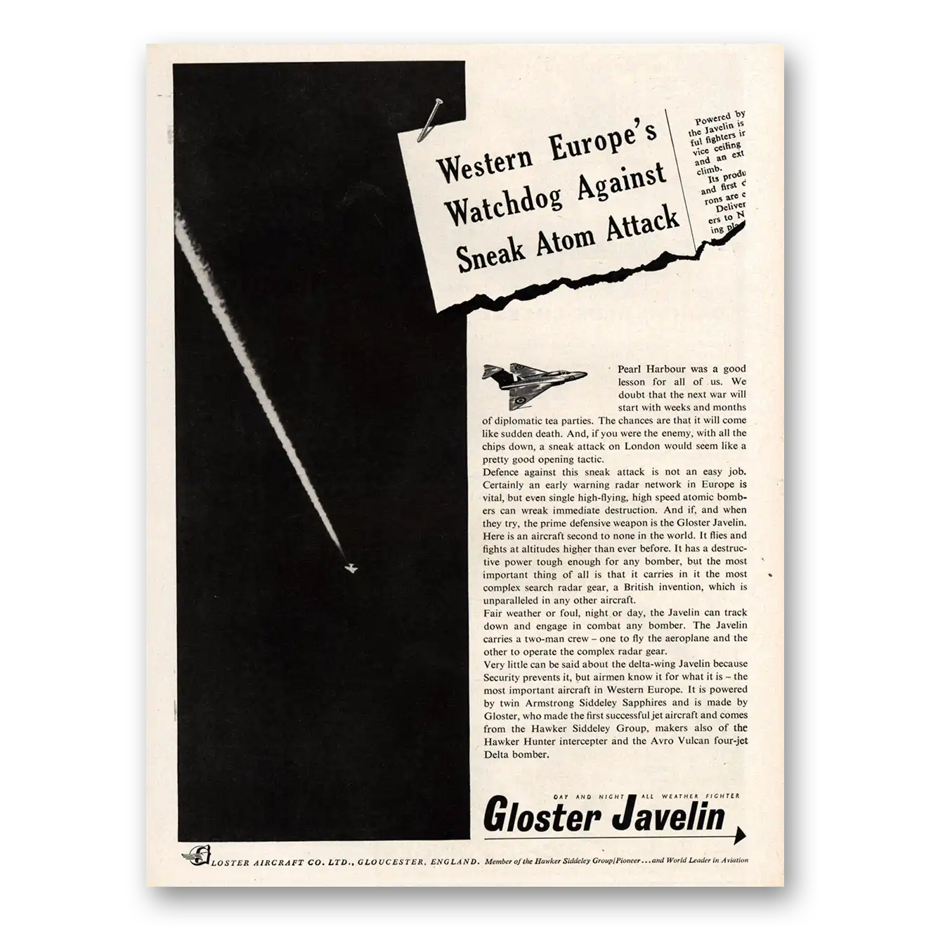 1955 Gloster Aircraft Print Ad | Javelin Watchdog