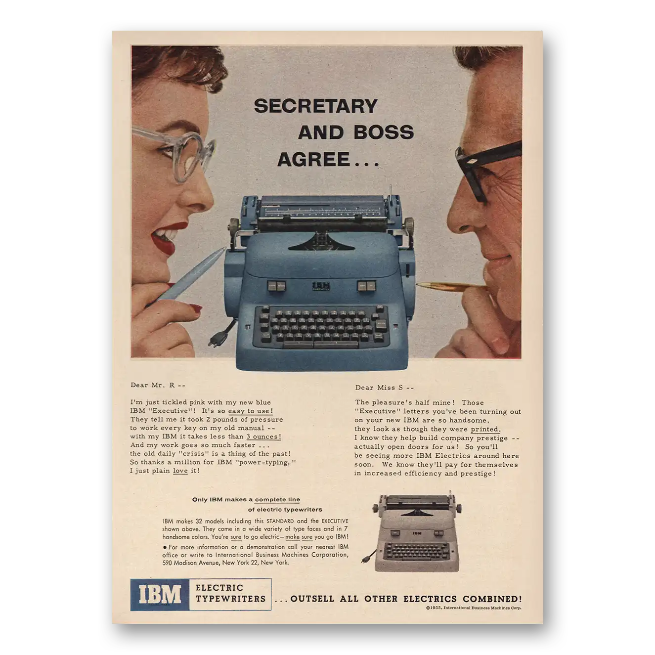 This is an original 1955 IBM Electric Typewriter print ad published by IBM.