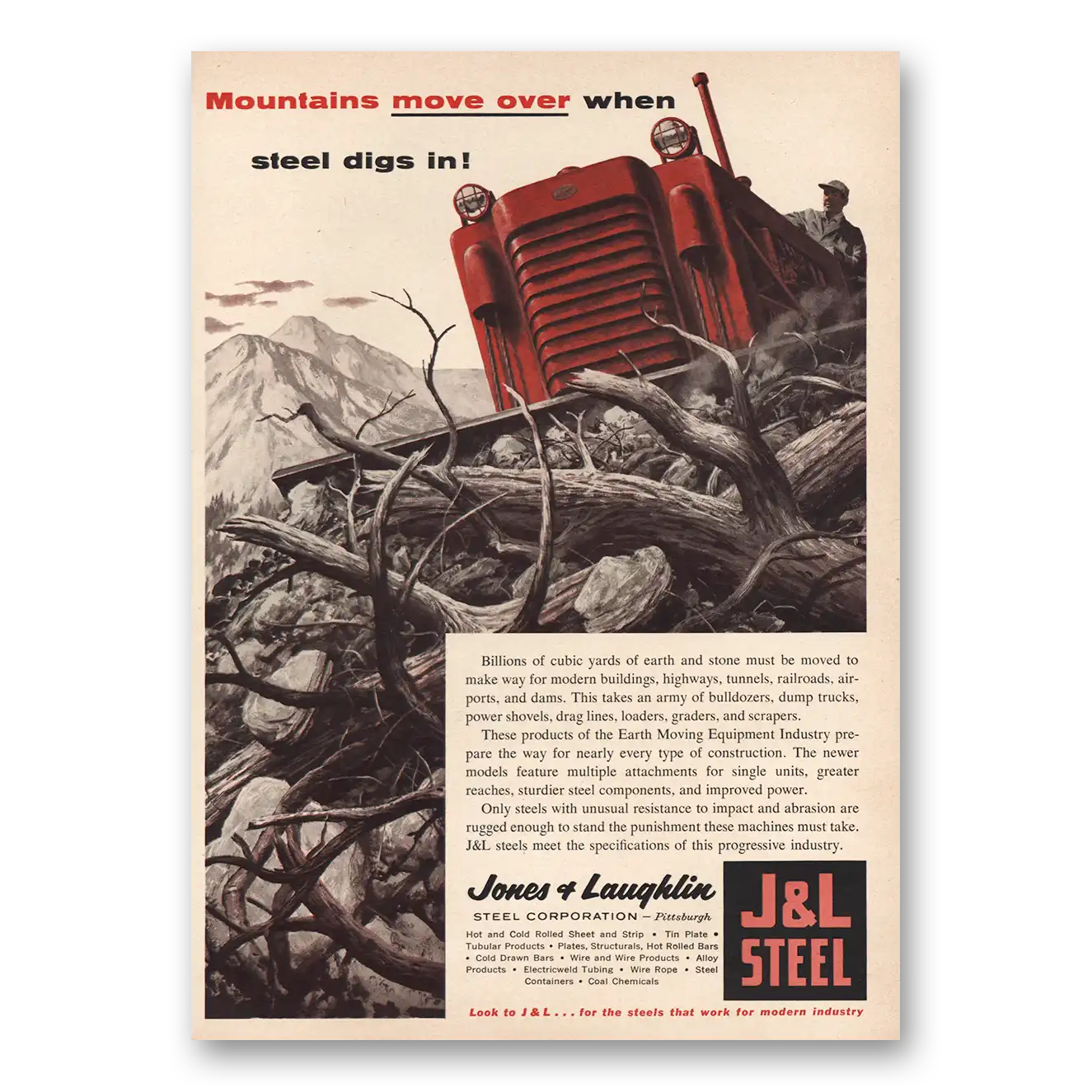 1955 J & L Steel Print Ad | Mountains Move Over