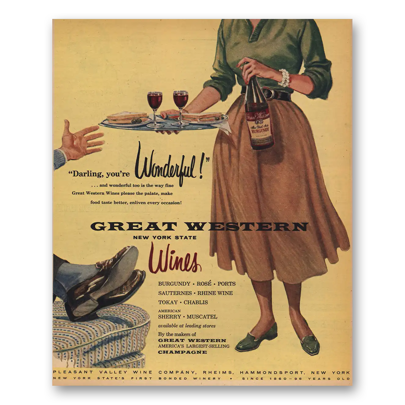 This is an original 1956 Great Western Wines print ad published by Pleasant Valley Wine Co.