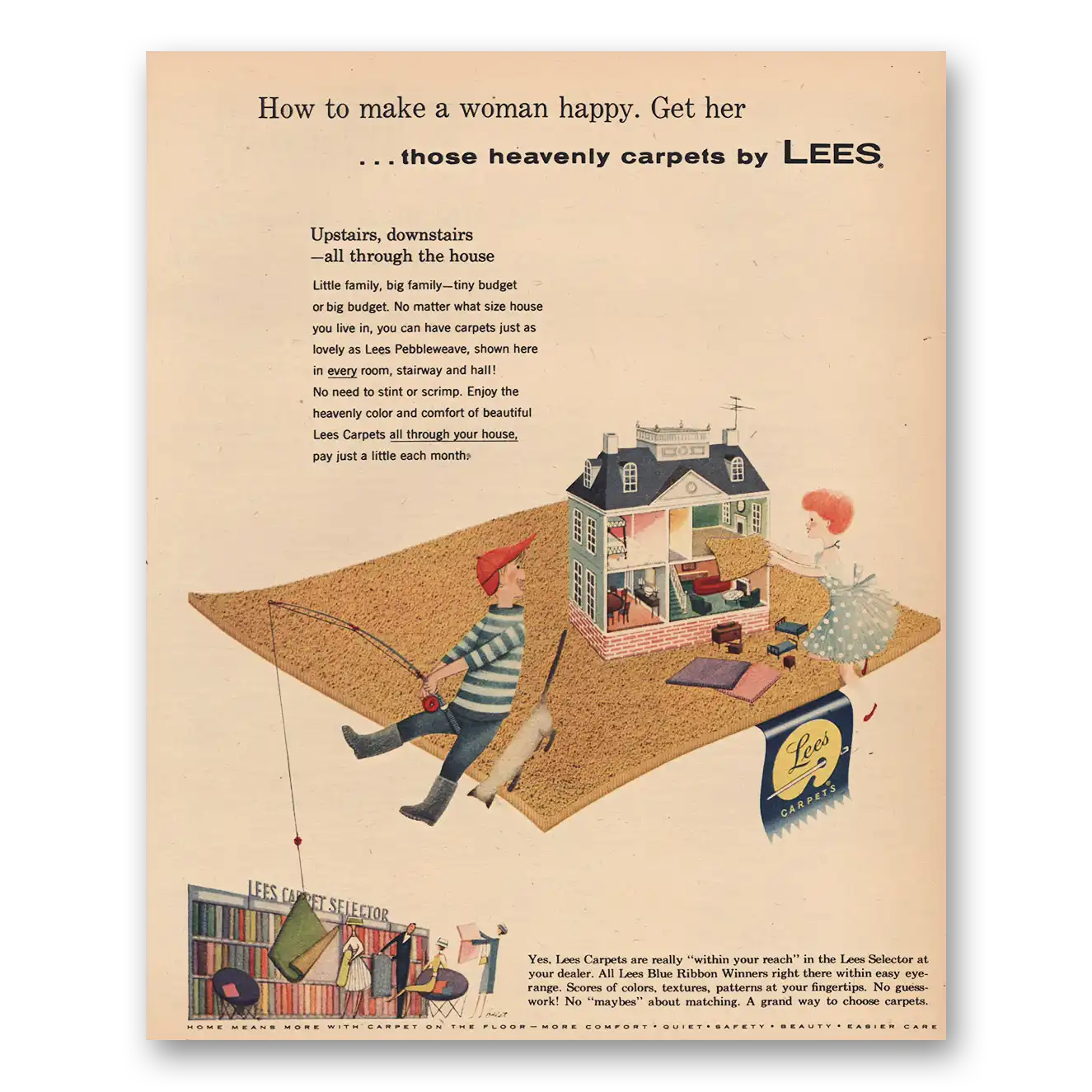 1956 Lees Carpet Print Ad | Make Woman Happy