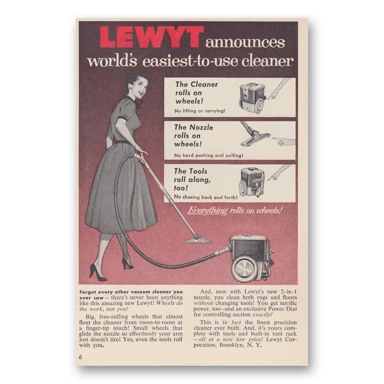 1956 Lewyt Vacuum Cleaner Print Ad | Worlds Easiest