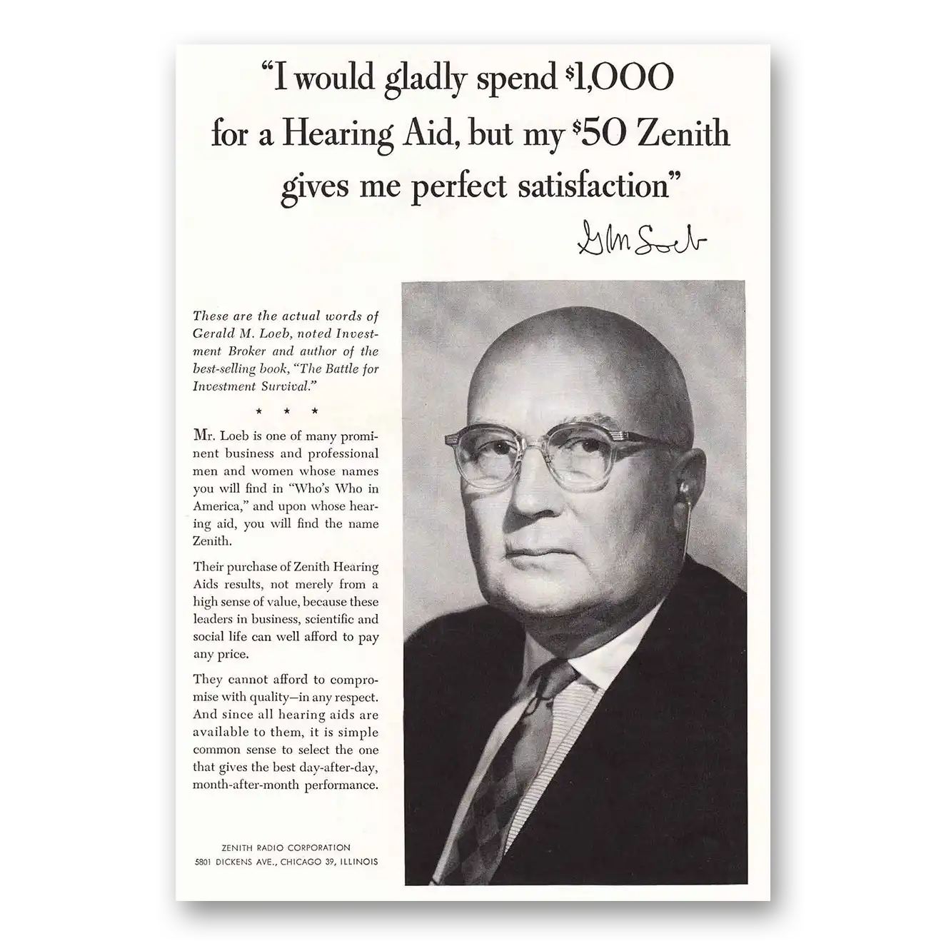 1956 Zenith Hearing Aid Print Ad | Gerald M Loeb