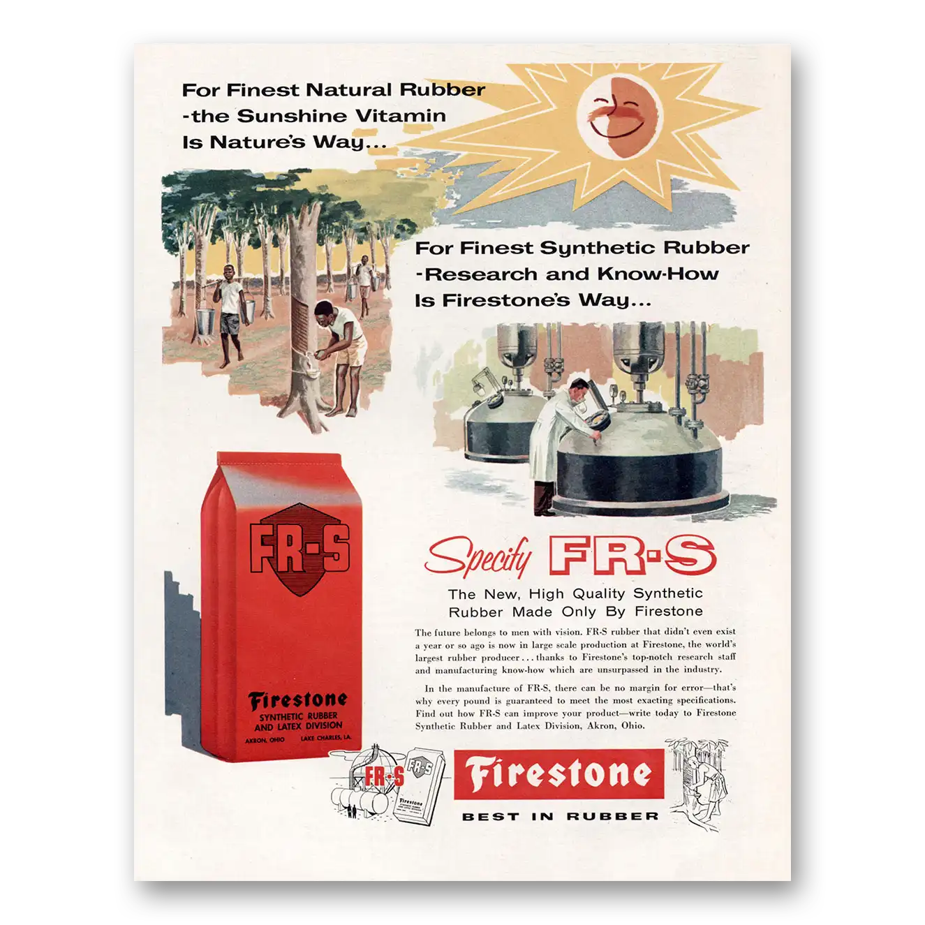 1957 Firestone FRS Synthetic Rubber Print Ad | Sunshine Vitamin