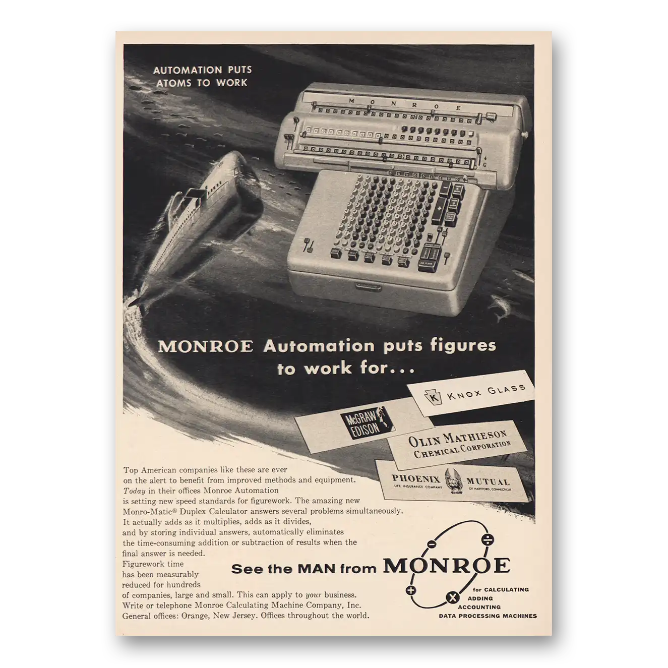 1957 Monroe Calculating Machines Print Ad | Atoms