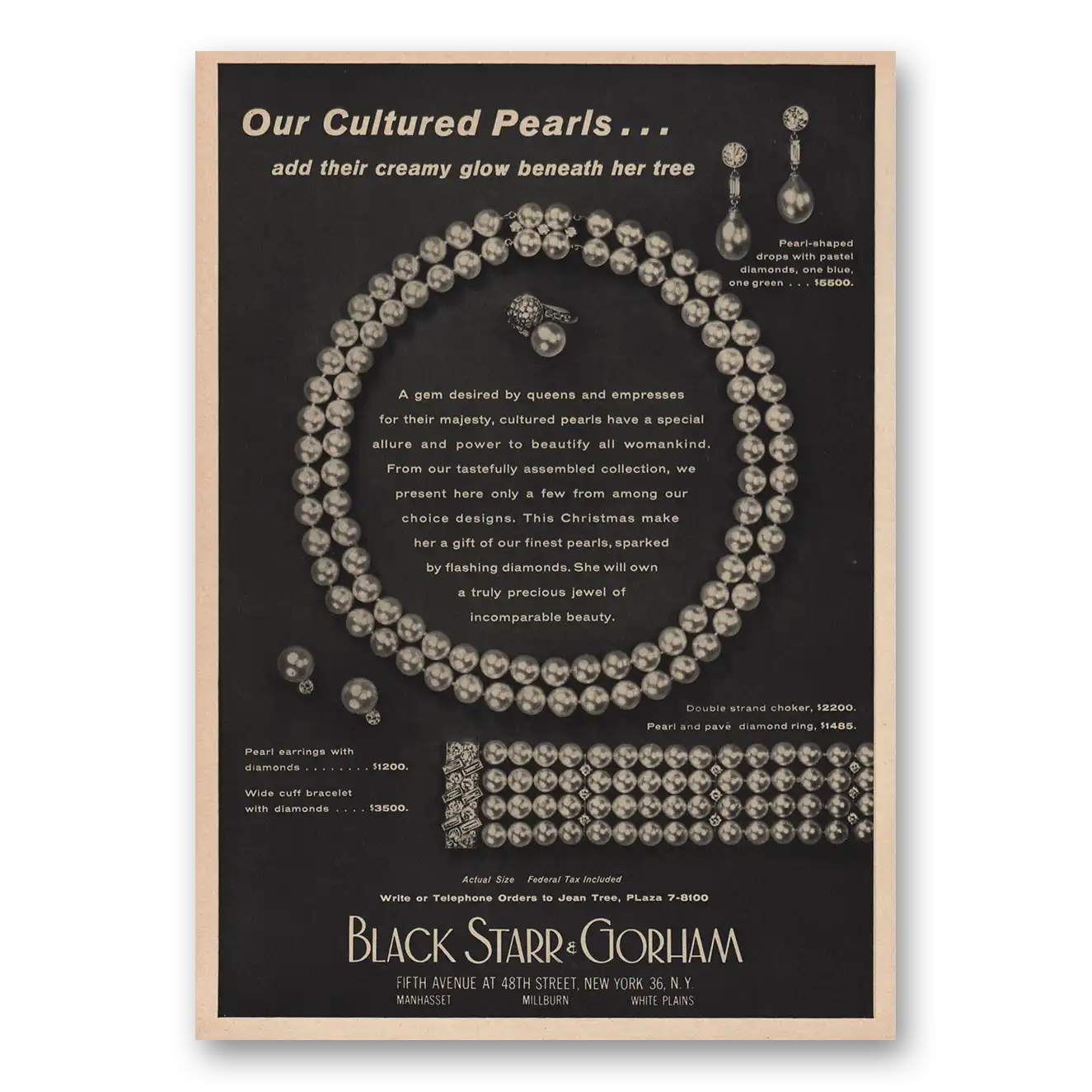 1958 Black Starr Gorham Print Ad | Cultured Pearls