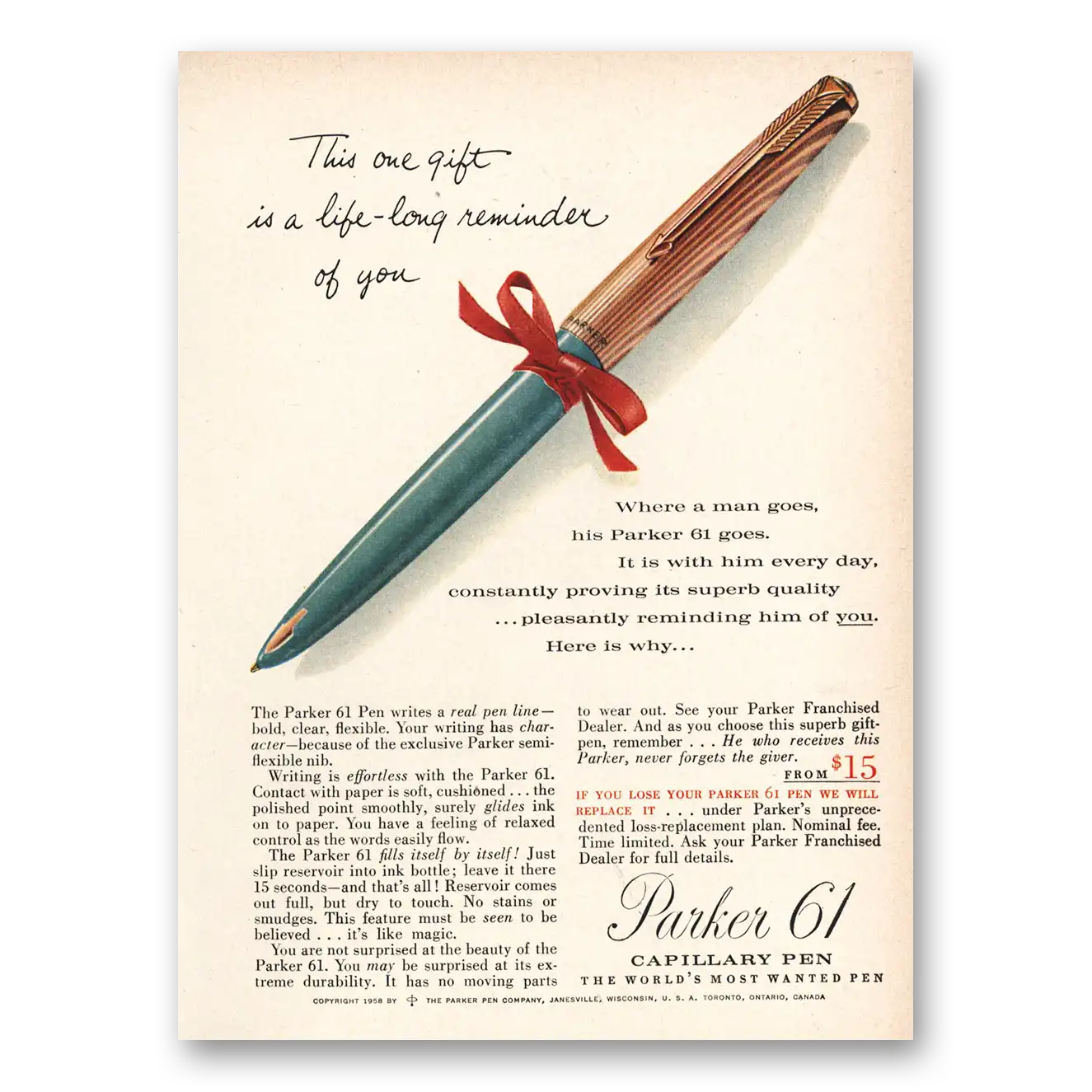 This is an original 1958 Parker 61 Pen print ad published by Parker Pens.