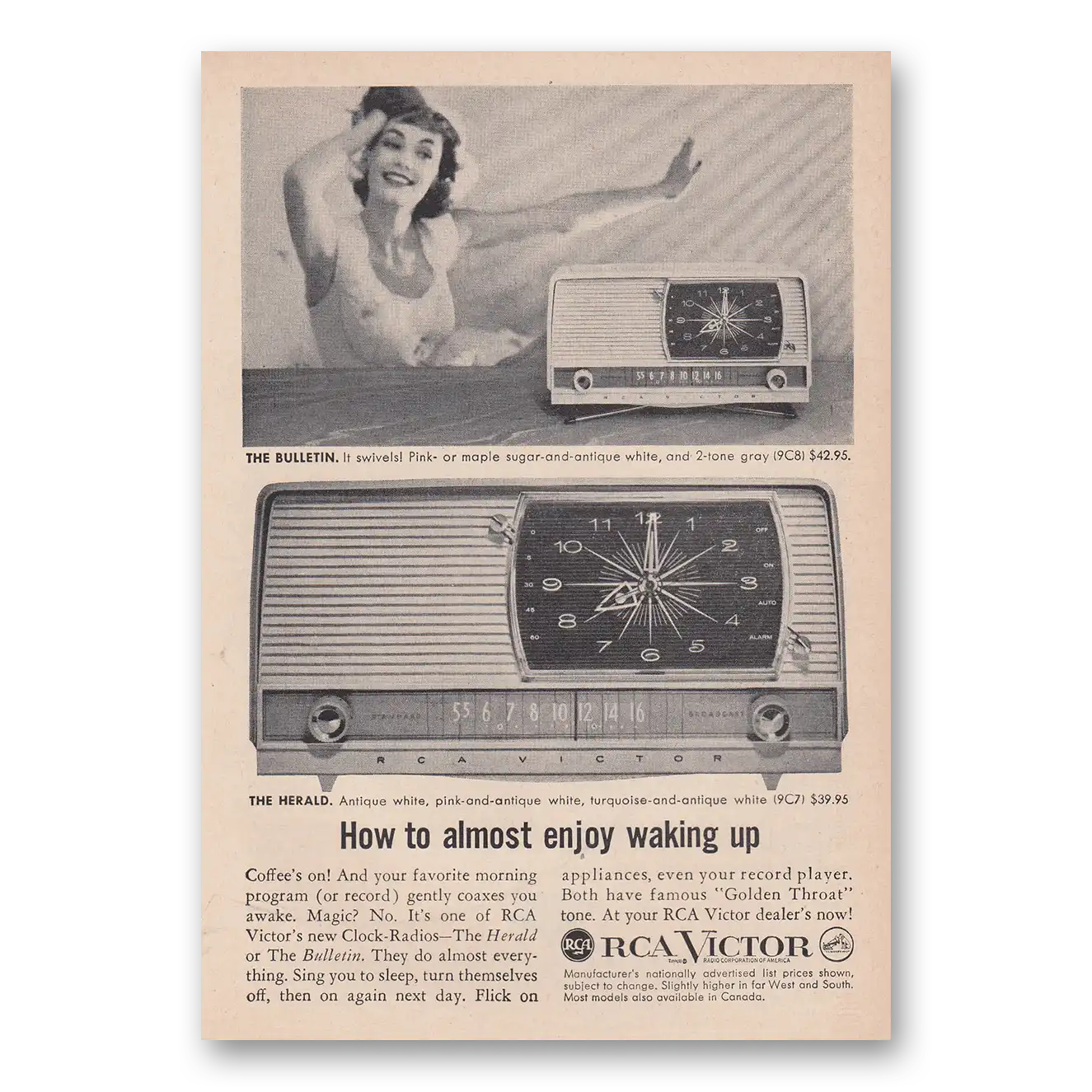 1958 RCA Victor Clock Radio Print Ad | Waking Up