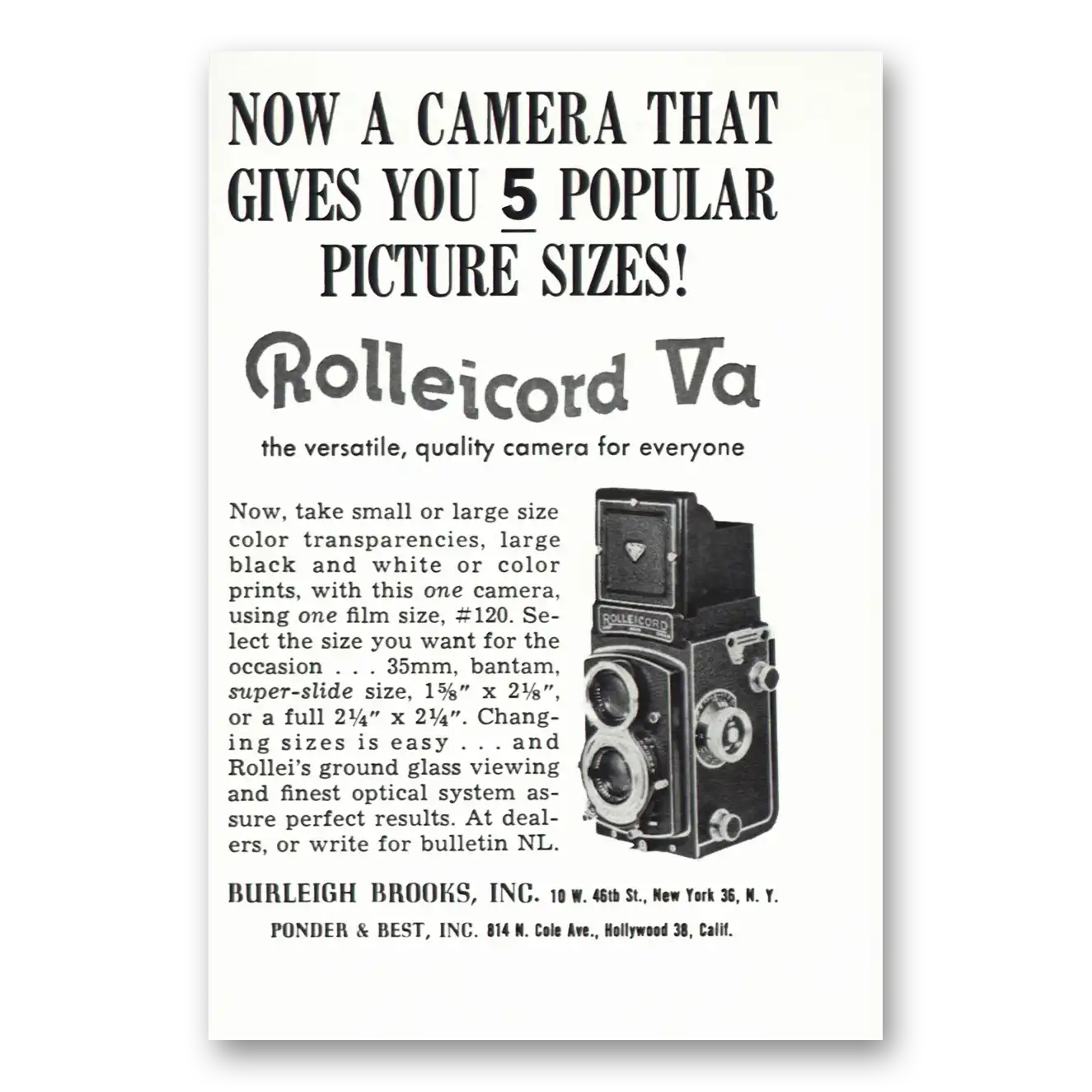 This is an original 1958 Rolleicord Camera print ad published by Burleigh Brooks.
