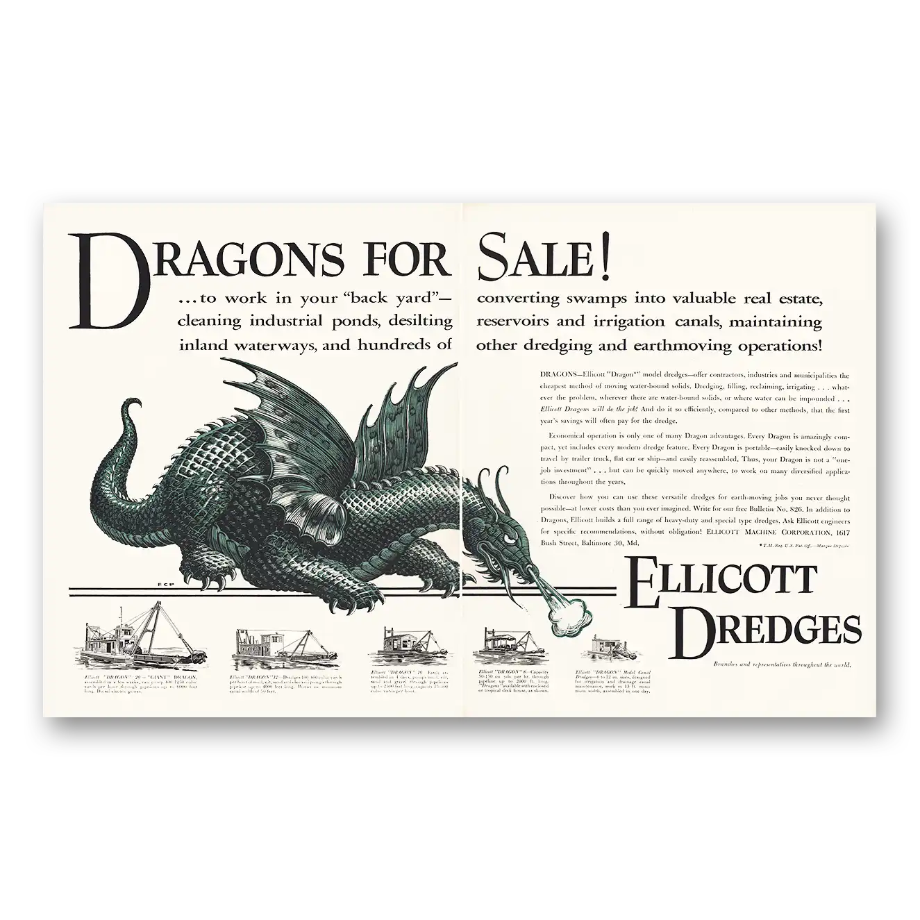 1959 Ellicott Dredges Print Ad | Dragons For Sale