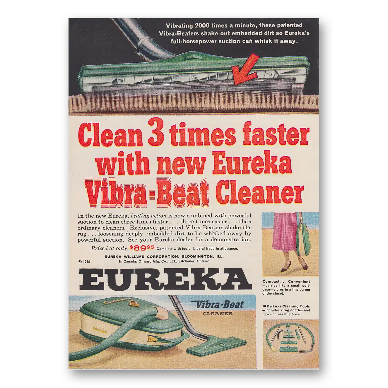 This is an original 1959 Eureka Vacuum Cleaner print ad published by Eureka.