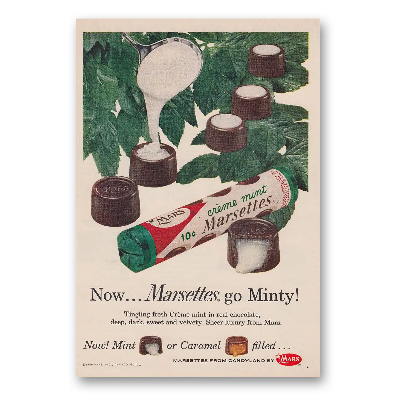 1959 Marsettes Candy Print Ad | Marsettes Go Minty