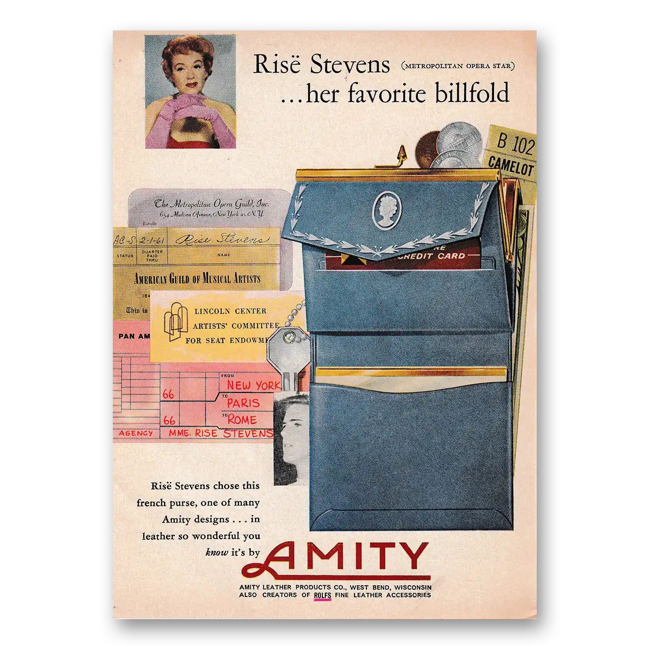 1961 Amity Leather Billfold Print Ad | Rise Stevens