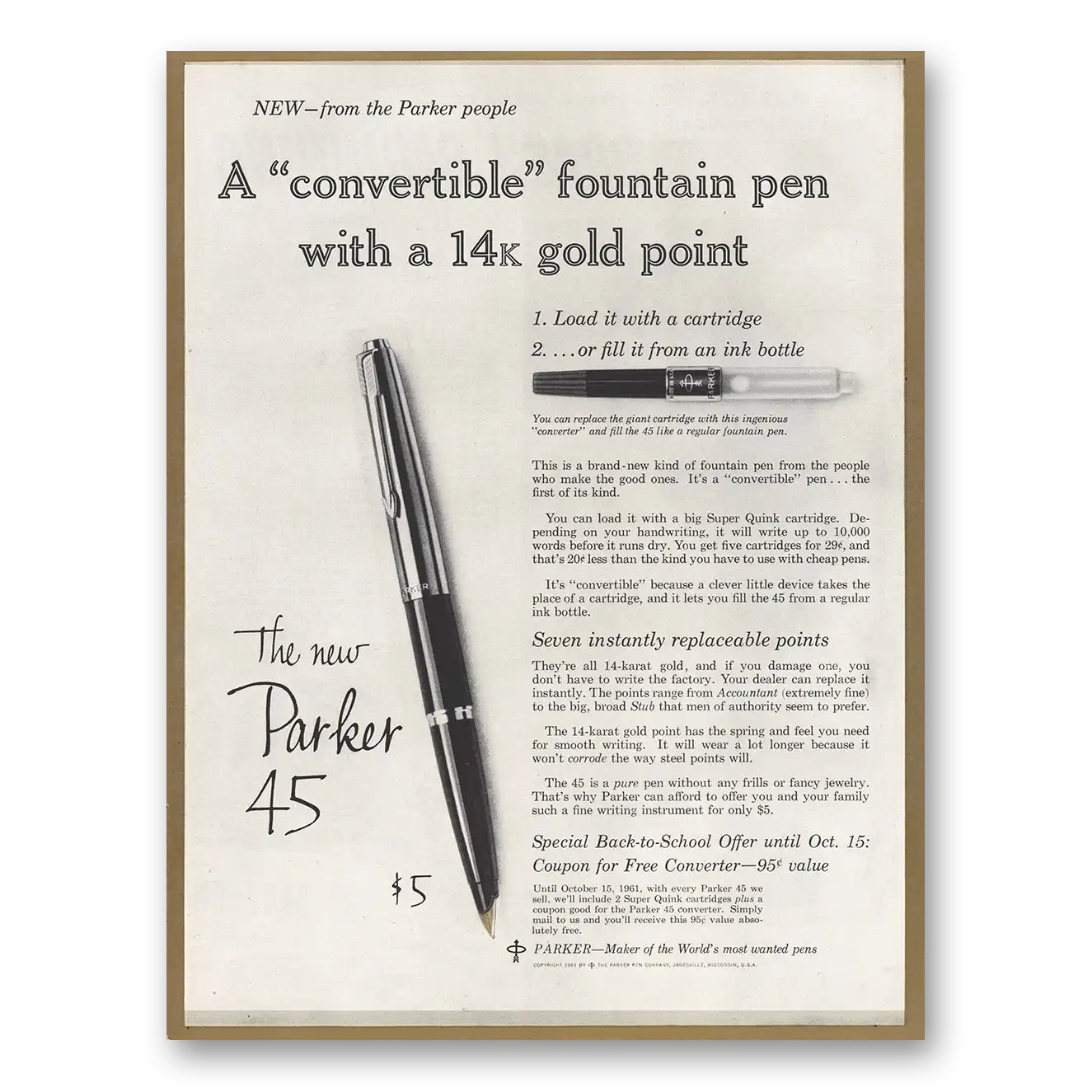 1961 Parker 45 Pen Print Ad | 14k Gold Point