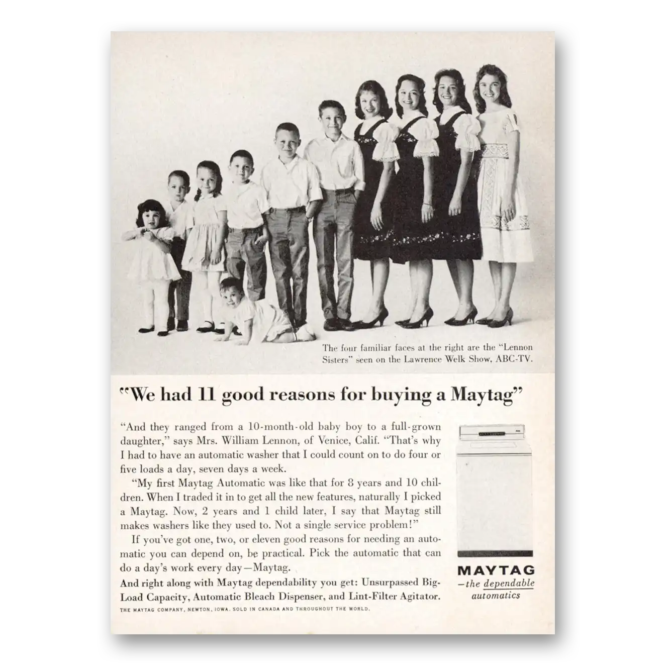 1962 Maytag Washer Print Ad | Lennon Sisters