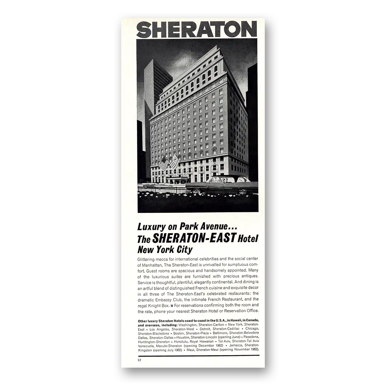 This is an original 1962 Sheraton East Park Avenue Hotel print ad published by Sheraton Hotels.