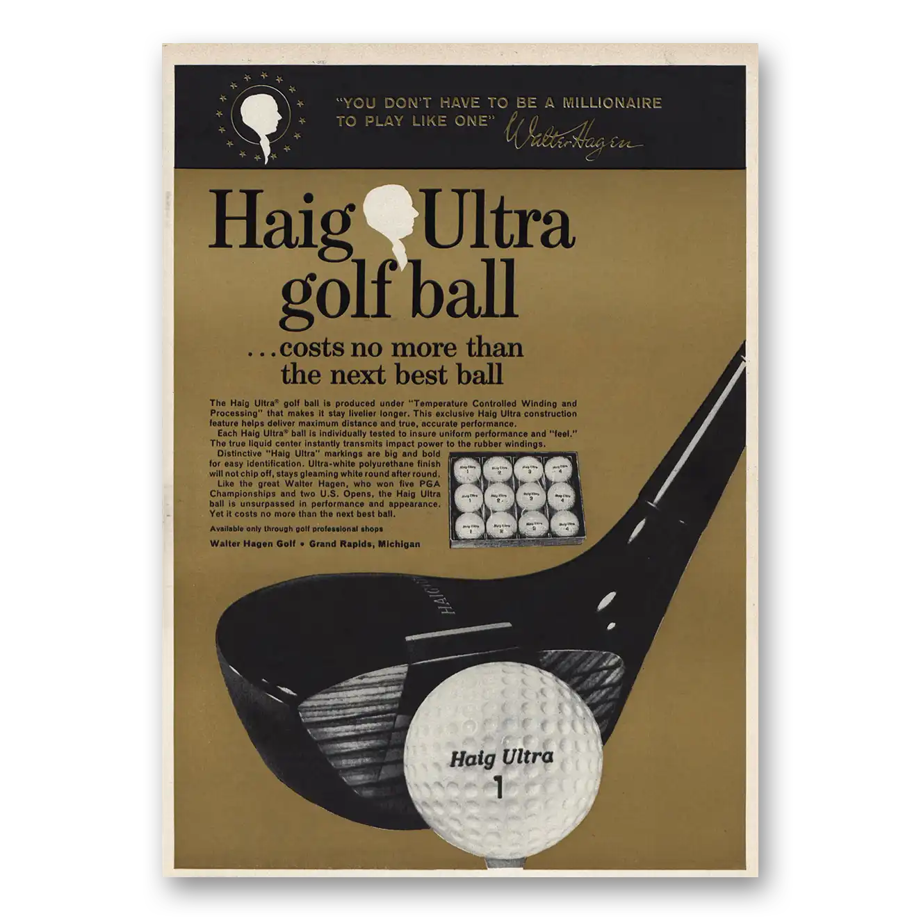 This is an original 1963 Haig Ultra Golf Ball print ad published by Walter Hagen Golf.