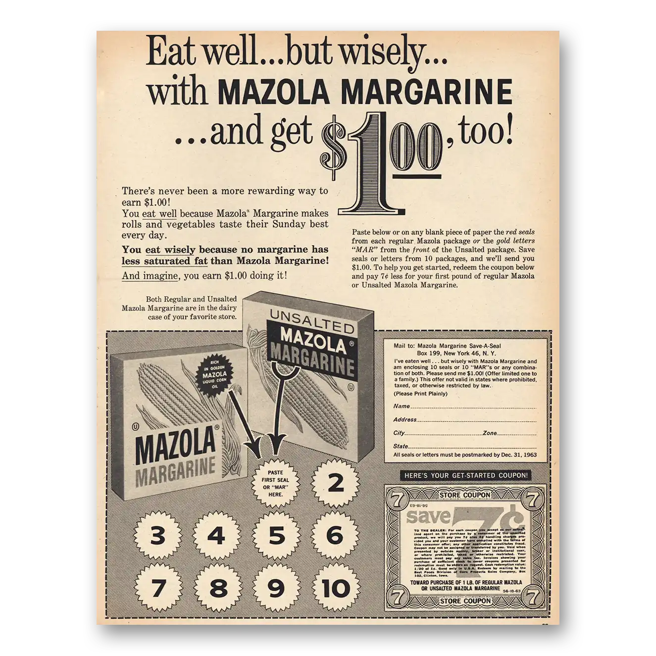 1963 Mazola Margarine Print Ad | Eat Well But Wisely Coupon
